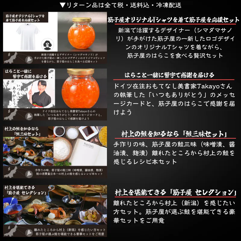 旬の時期に村上市で取れる秋鮭の卵(いくら)を地酒のお酒と醤油に漬けこむことで、ご飯にぶっかけても「贅沢で芳醇な香りと味わい」です。筋子屋こだわりの独自製法で、老若男女問わず大人気の商品でした。