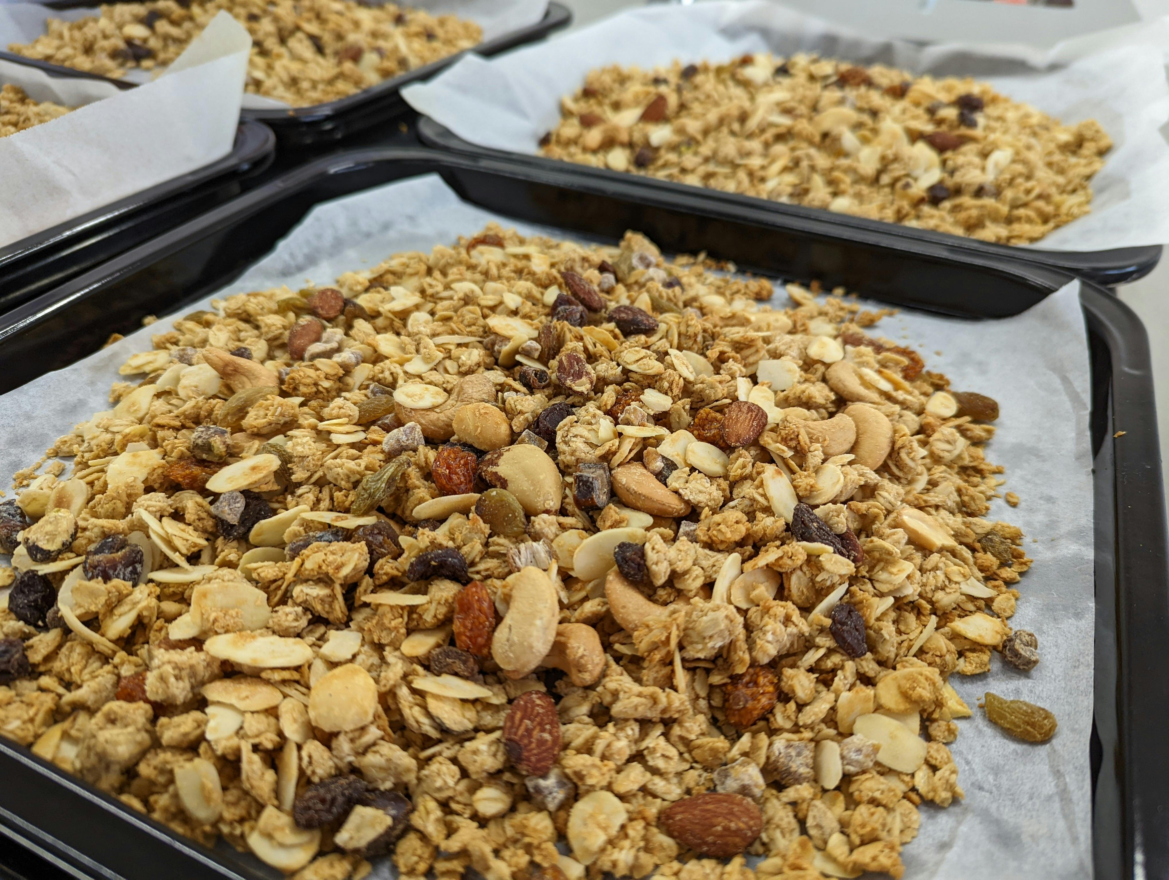 朝日製粉所の米粉や玄米粉と有機オートミール、甘酒などを合わせ、オーブンで香ばしく焼き上げました。有機メープルシロップでコクを出し、有機ココナツオイルを使用することで食感はザクザク!