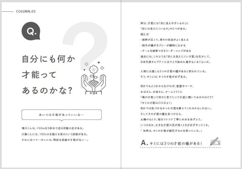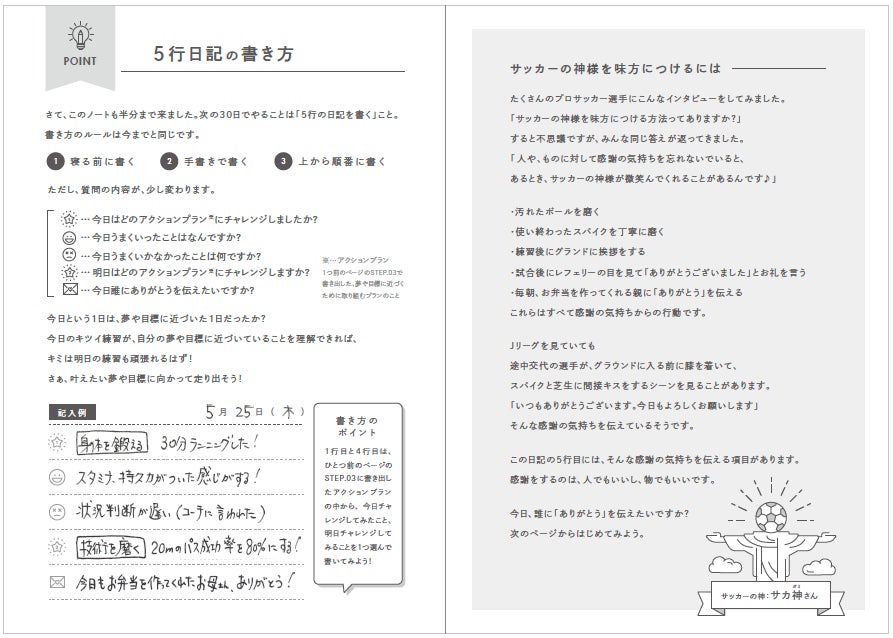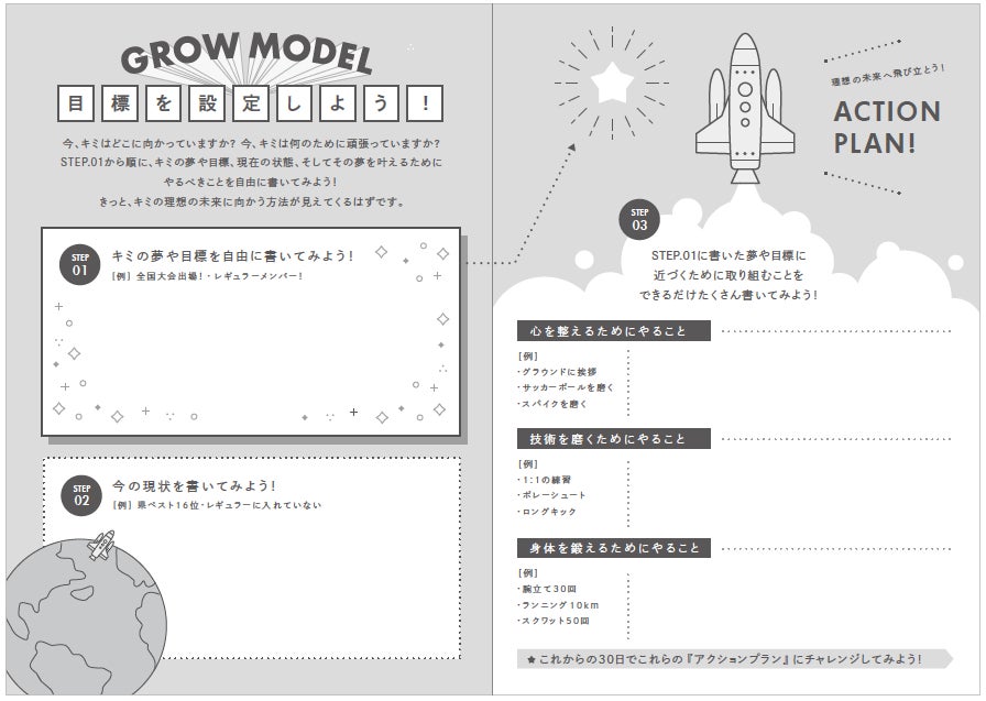 思春期で不安定な小学生高学年や中学生年代は、自分の感じたことや考えたことを言葉にする能力=言語化能力を育む必要性があります。そのためには1日の終わりに、”今日はどんな1日だった?””明日はどんな1日にする?”などの簡単な質問に答え、それを書き出す練習を積み重ねることで、自分の心が”見える化”され、複雑な思考もシンプルに整理できる様になります。また”やらされる練習”ではなく自分の目標に向けた”意味のある練習”を自分で考える能力も身についていきます。これを60日間繰り返すと、徐々に自信が生まれ、”自分のココロとつながる”感覚が生まれてきます。