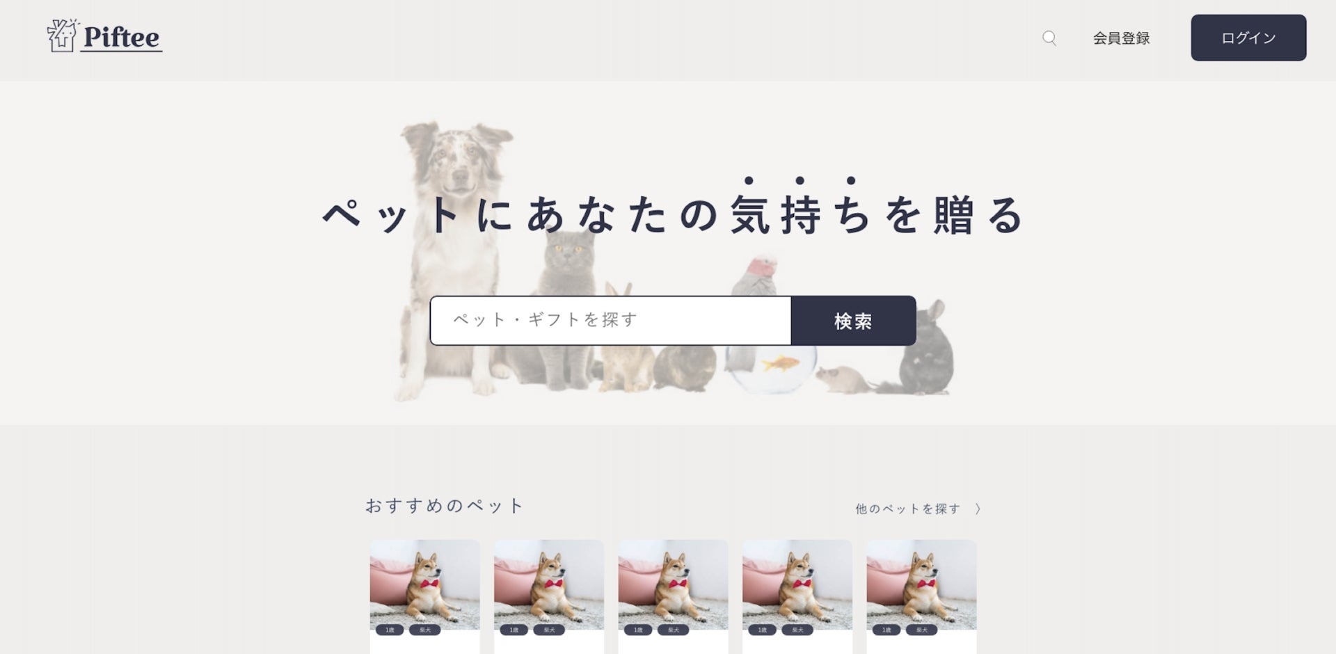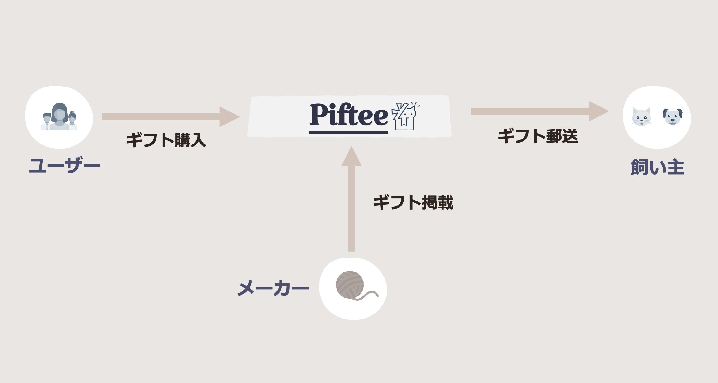 Pifteeは相手に個人情報を一切開示することなく、プレゼントを贈れるプラットフォームを目指しております。プラットフォームに掲載されたペットグッズをユーザーが購入し、グッズが飼い主の元へ直接届くといった流れです。