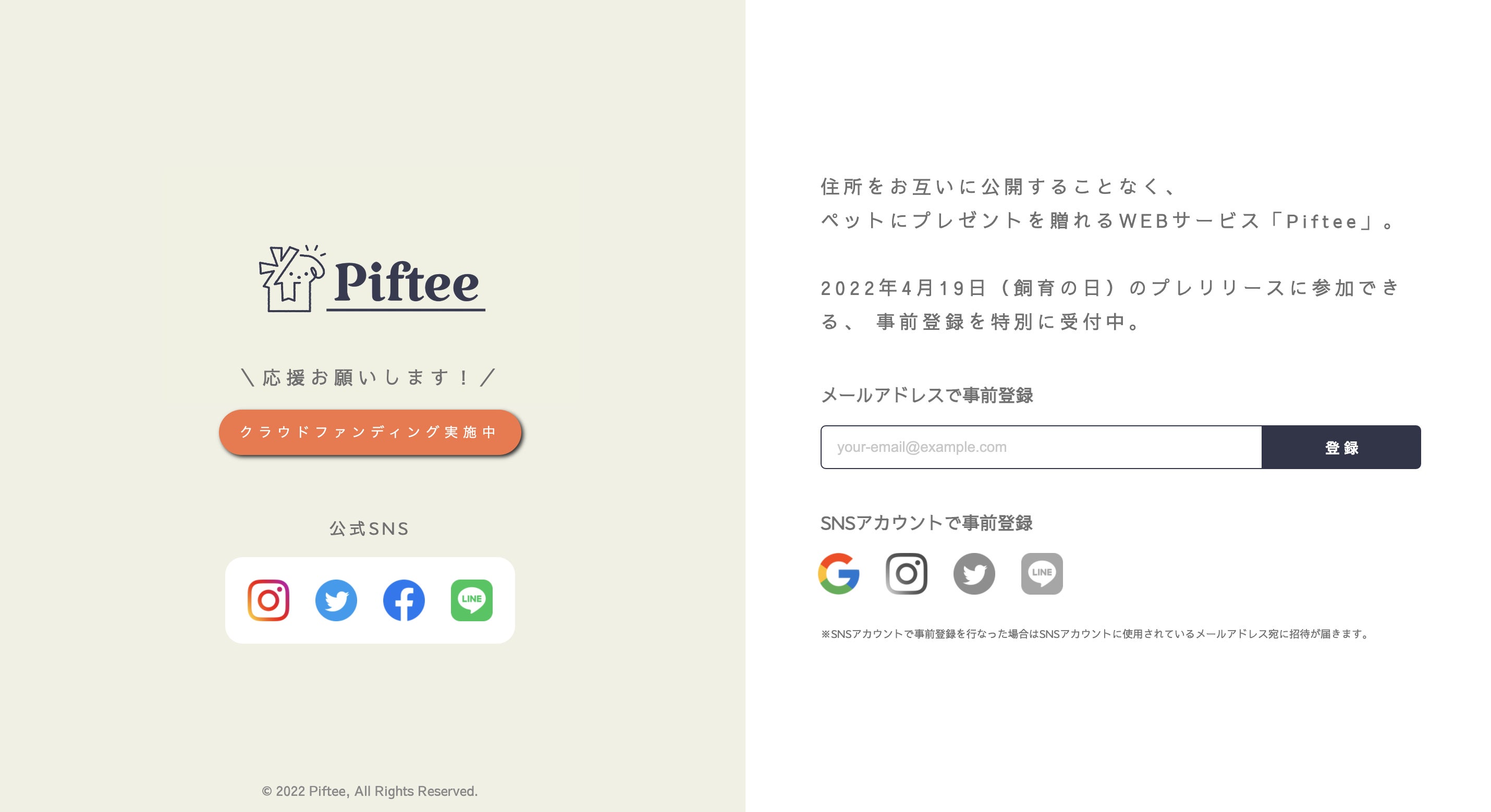 あなたのペットに関する情報を集約し、欲しいプレゼントを募集する、このようなサービスをPifteeでは構想しております。