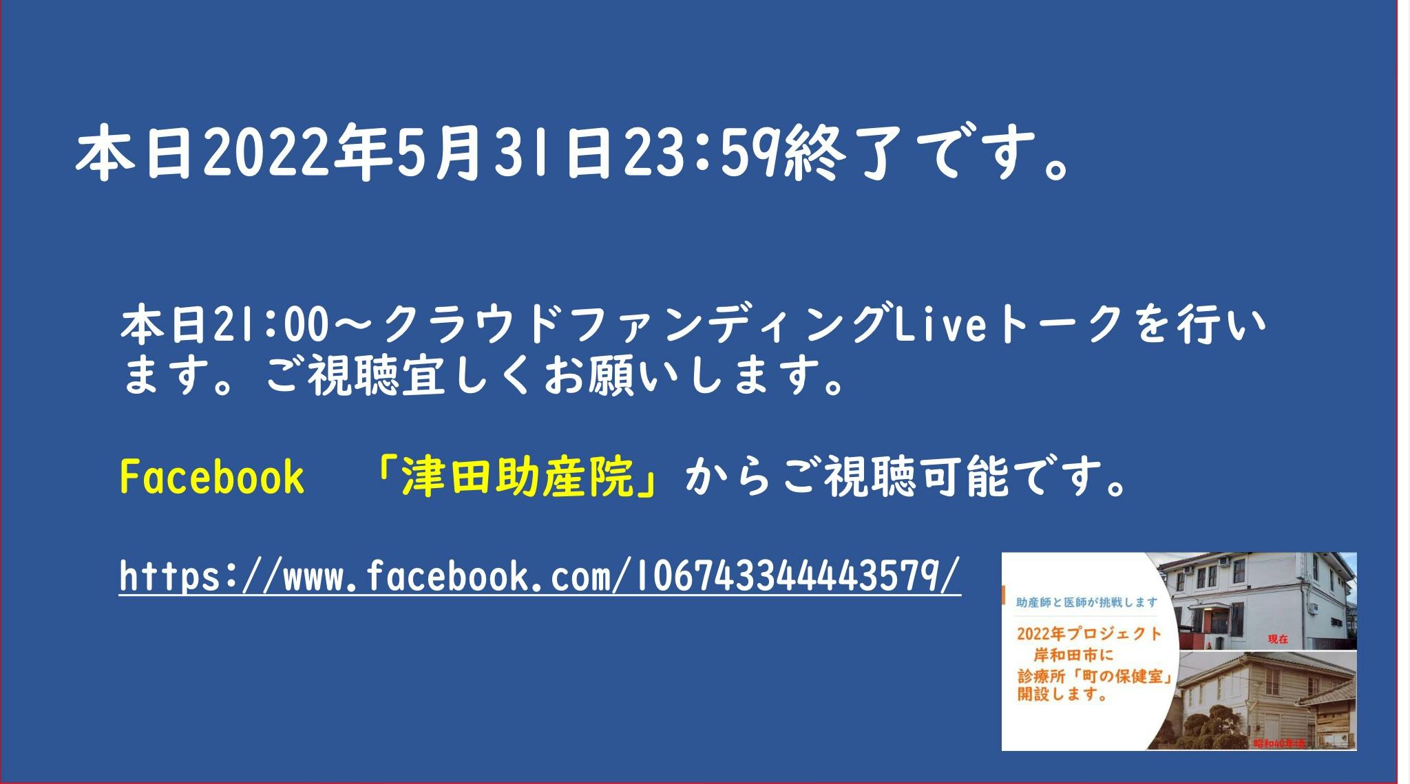 2022/05/31 15:35https://www.facebook.com/106743344443579/本日23:59 でクラウドファンティングは終了いたします。終了カウントダウンにむけて、本日21:00~Liveトークをします。上記リンク先face book「津田助産院」からご視聴頂けます。宜しくお願いします。プロジェクト代表 津田育久子 もっと見る