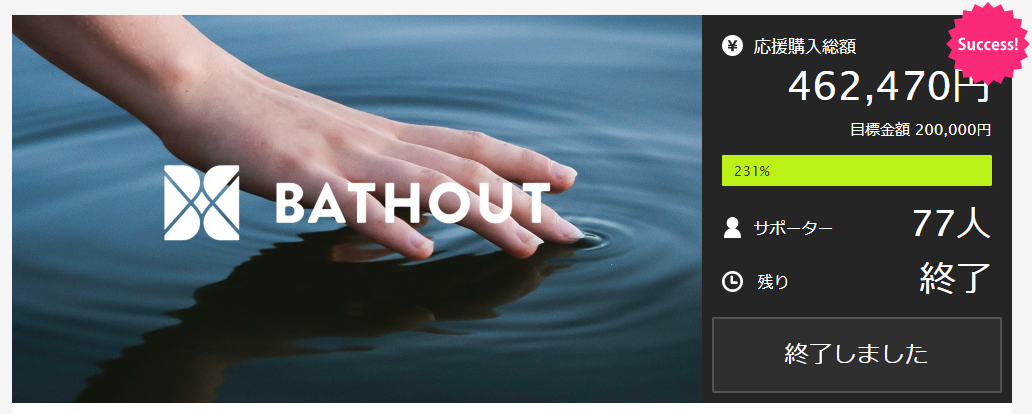 BATHOUTは、2022年2月に他社様の国内クラウドファンディングにて最初の先行販売にチャレンジ、77名の方にご支援いただき、目標金額の200%以上を達成することができました。