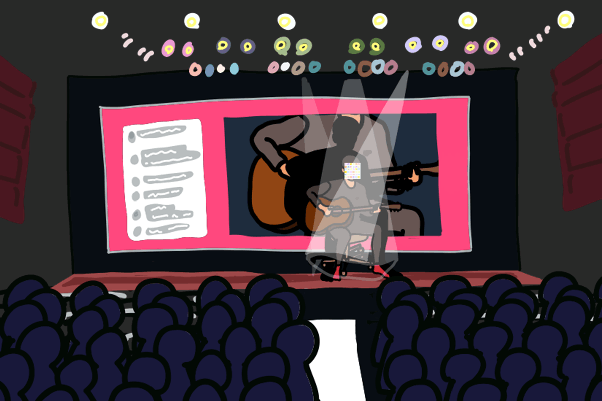 スタッフさんのギター漫談 at Mildom現在もしぬこのSNSフォロワー数やライブ配信参加数を考えると200人を集めることは簡単ではありません。しかし、常にチャレンジし続けたいという想いから200人という人数にしました。そして、会場のSHIBUYA PLEASURE PLEASUREのキャパシティが318名(着席)のためチャレンジする人数にちょうど良いと感じました。また会場の雰囲気もかっこいい。カリンバンドは動画とリアルなギターを融合したLIVEなのでスクリーンを使ってライブを行います。元々映画館を改装してライブホールにしているので248inchの大きなスクリーンと、臨場感のあるサウンド、そして映画館のどこからでも見渡せる座席仕様になっているため理想な場所だと思いました。