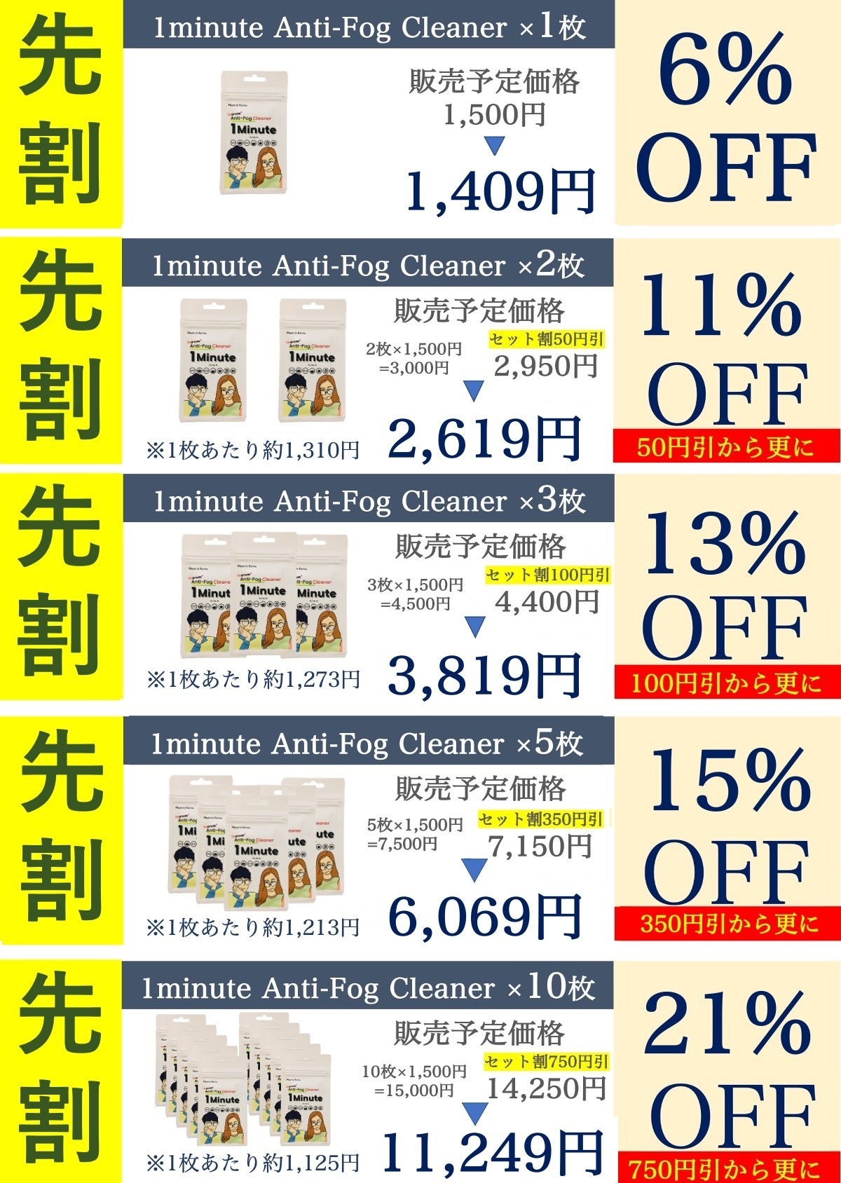 2023/12/07 18:24みなさま曇り止めクロス”1minute”事務局の今村です。ただいまよりプロジェクトを開始致しました!【期間限定】抗菌効果!曇ったメガネを解消!進化版曇り止め"1minute"今回、世の中の物価高に対抗ということで、短期間の間に特別価格でご提供させていただきます。お求めやすくなっておりますため、この機会をご活用いただければと思います。本キャンペーンは、今回が最後になる場合がございますのでご了承下さい。ご希望の方はお早めにお買い求めくださいませ。引き続き、何卒よろしくお願いいたします! もっと見る【緊急告知】