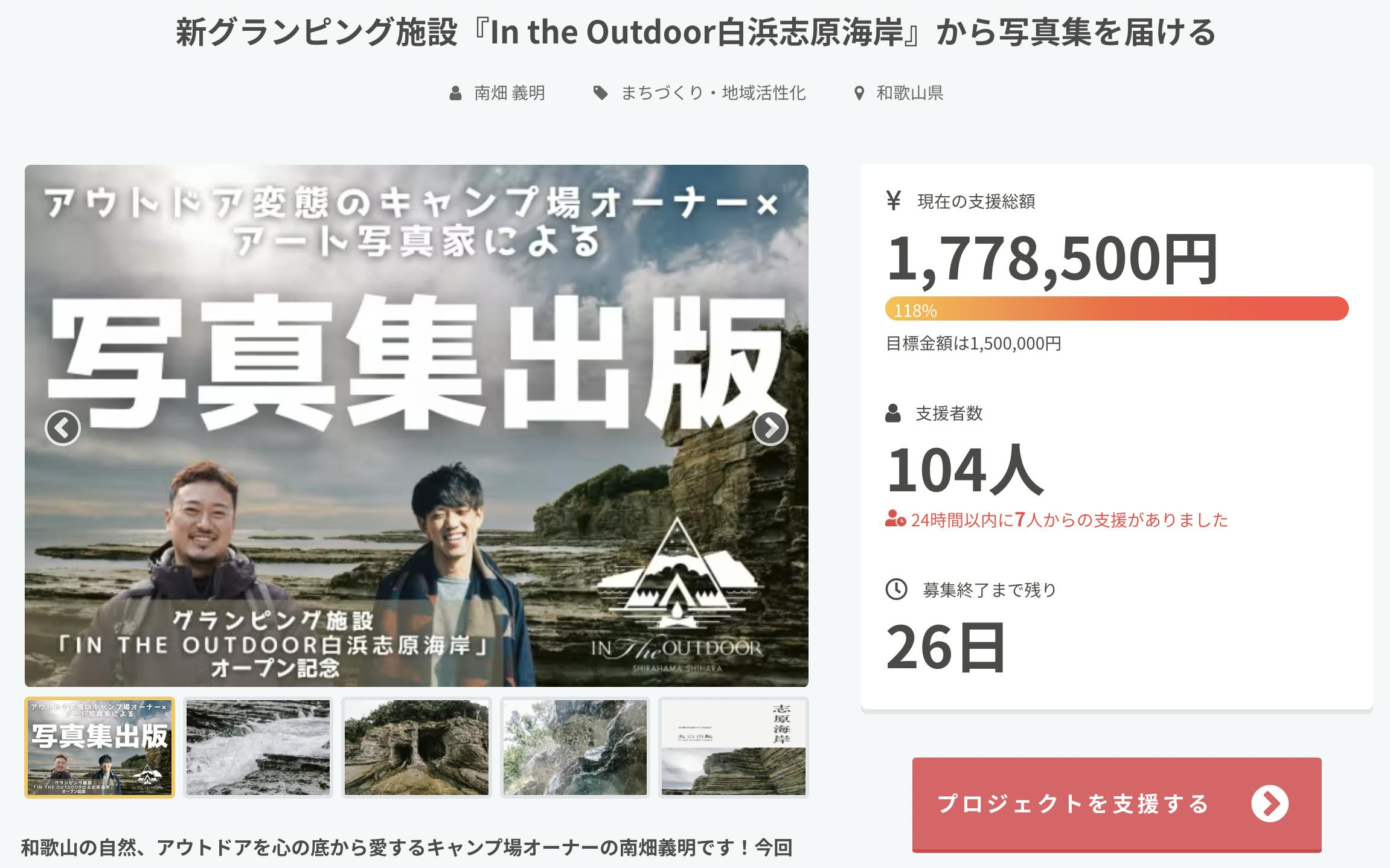 2022/05/05 11:01クラウドファンディング「新グランピング施設『In the Outdoor白浜志原海岸』から写真集を届ける」、お陰さまで100%達成しました!お一人お一人のご支援に心から感謝いたします。クラウドファンディングは、やったことのある方ならご存知かもしれませんが、「集まらなかったらどうしよう」と向き合う恐怖のどん底のような時間があります(苦笑)「自分は応援してもらうにふさわしい人間なのか?」を問い続けて、それを乗り越えた人だけが挑戦できる場所だと思うので、本当に挑戦される皆さんはすごいし尊敬します。そして、僕も資金繰りがある程度落ち着いたら、積極的に誰かの支援をしたいと思っています。※目標の支援額を達成したら「ネクストゴール」を設定するのが恒例のようで、どうしようか考えたのですが、次の目標は「支援者数」にしたいと思います。金額で目指すべきポイントが特にないのと、写真集の出版が確定したことで、僕自身の一番大きな課題が「グランピング施設を一人でも多くの方に知ってもらうこと」に変わりました。新規オープンの宿泊施設の課題は、常に「多くの方に知ってもらうこと」です。どうすれば多くの方に知ってもらえるのか。無い知恵を絞って、頑張っていきます!先日のNHK和歌山さんみたいに、メディア取材とか受けられると嬉しい。なので、関西方面の番組ディレクターさんを紹介してもらえたりすると、めちゃくちゃ喜びます!でも、大事なことは地味で地道なことだということも忘れずにいきたいです。皆さんのお陰で次の目標にしっかり向かっていけます。本当にありがとうございます。 もっと見る