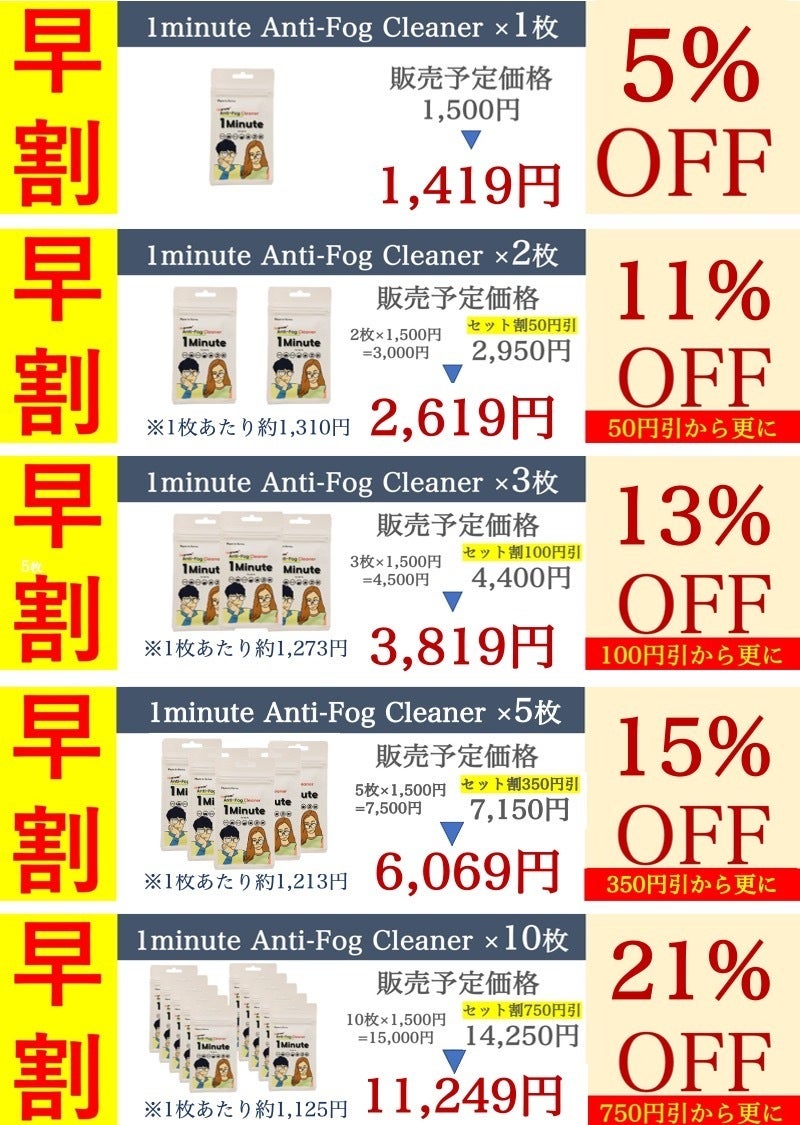 2023/12/07 18:30みなさま曇り止めクロス”1minute”事務局の今村です。ただいまよりプロジェクトを開始いたしました!【期間限定】抗菌効果!曇ったメガネを解消!進化版曇り止め"1minute"今回、世の中の物価高に対抗ということで、期間限定で特別価格にてご提供させていただきます。お求めやすくなっておりますため、この機会をご活用いただければと思います。本キャンペーンは、今回が最後になる場合がございますのでご了承下さい。ご希望の方はお早めにお買い求めくださいませ。引き続き、何卒よろしくお願いいたします! もっと見る【緊急告知】