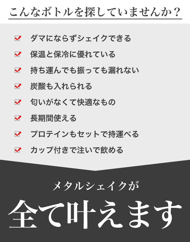 メタルシェイクは、ステンレス鋼SUS304を、内側・外側の両側に贅沢に使用しています。