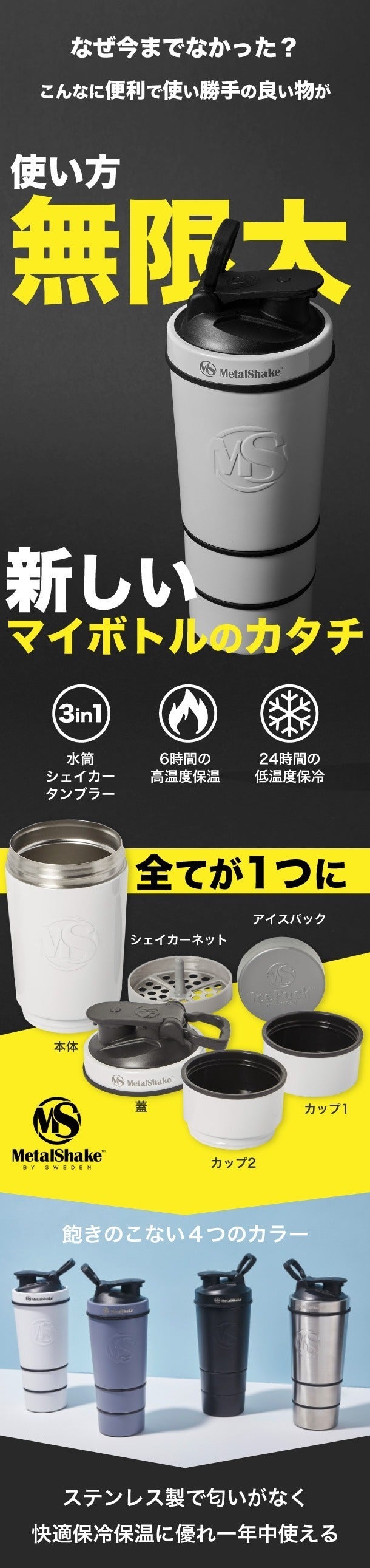 メタルシェイクは更に2重断熱構造で、最大6時間保温と最大24時間保冷を実現しています。
