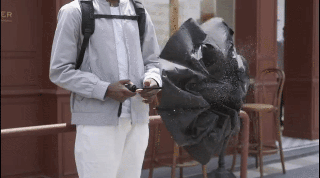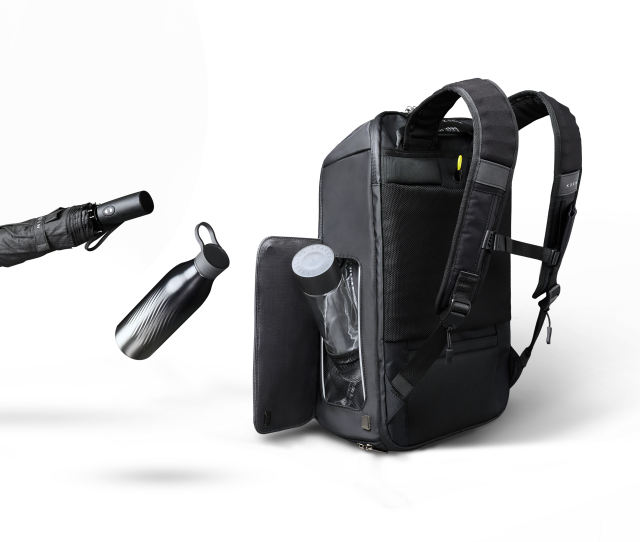 隠しポケットとメインコンパートメントは水に強い生地で区分けされており、使用済みの傘や水滴のついたペットボトルをお入れいただくこともできます。