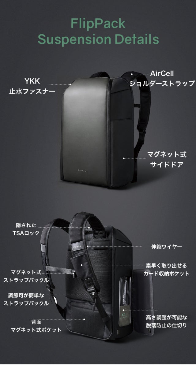 FLIPPACKはKorinDesignの基本コンセプト【安全安心を担ぐ】機能はしっかり持ち合わせていますが、その機能がすべて【隠され】【アップデート】されています。