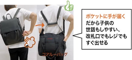通常のリュックは、荷物の出し入れが不便だったり背中が暑くなりがちですが、コアルーのリュックスタイルなら背中が空くため暑くなりにくくとても夏場でも動きの多い時でも汗をかきやすい方にもおススメです。