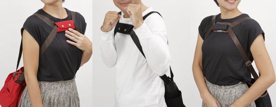 コアルーは特許取得のベルトの構造で、引っ張るだけで、腕を入れるだけで掛け方を簡単に変えることができます。1本で5通り。付け替えも不要、出し入れなどの面倒も不要。そんな魔法のような使い方を可能にしたのは、真ん中の動くパッド。真ん中にある時には1本のベルトに見えるけど、動くと二重になっている両側のベルトに腕を入れる空間ができるのです。