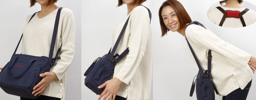 ①普通のショルダーのように見えて ②腕を入れるだけで落ちにくく安定する(メッセンジャースタイル)③ぱぱっとリュックに変身(付け替えなどは不要)④前に持てるバッグにもなって重さを分散 ⑤パッドが前にくるリュッににも。まるで魔法のように変幻自在な5WAYショルダーバッグです。