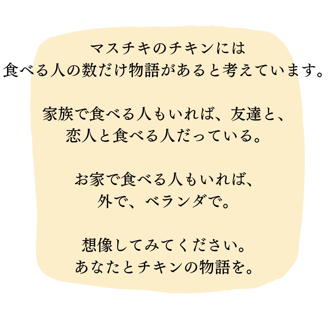 - マスチキのローストチキンは、『お酒にも合う大人なチキン』を目指して作られました。