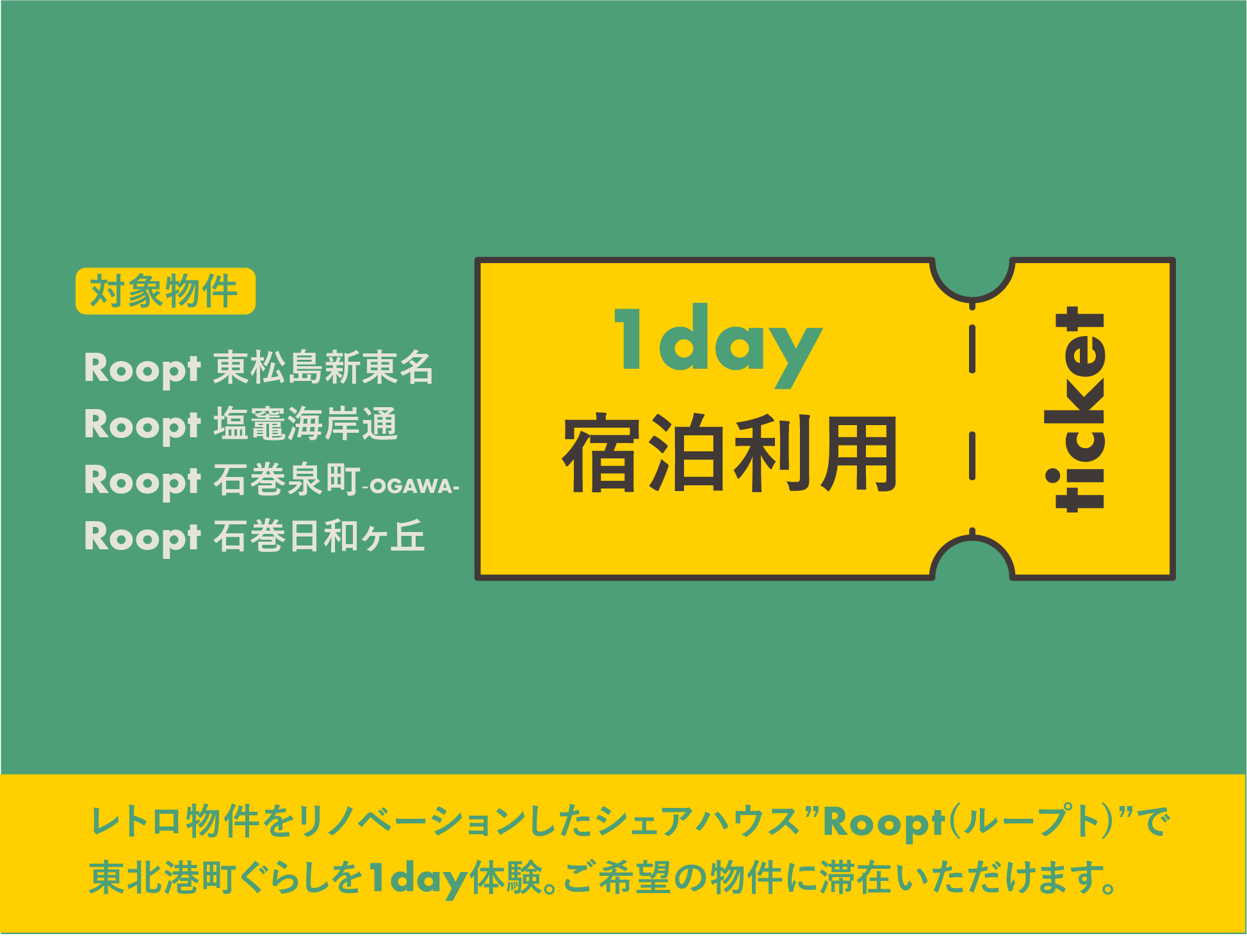 *チケットに含まれるもの:①Roopt物件への宿泊(2泊分)、②周辺地域の街歩きイベント、③シェアハウスでのイベント参加券(夕食付き)が含まれます。