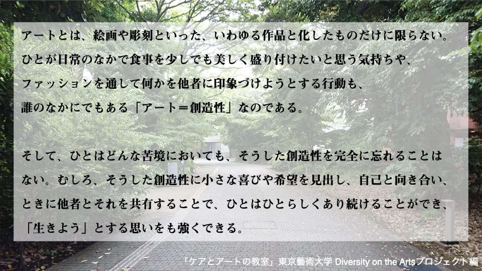 「アート×福祉」をテーマに「多様な人々が共生できる社会」を支える人材を育成するプロジェクト。 講師として、現代の社会に生きづらさを感じている当事者、社会と関わりを持ち表現を行うアーティスト、現代の福祉をより広い視点で捉え直す多様な分野の専門家の講義やアートプロジェクトなどの実践が行われている。