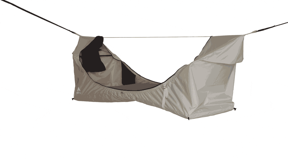 ヘブンテントは一般的なハンモックのように腰が沈み込まず、体を真っ直ぐに寝ることができます。