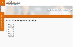 思いや行動に共感し支援いただいた企業や医療機関、団体名をクリニックのホームページに掲載させて頂きます(文字のみ)。地域のためになりたい、地域を活性化させたい、そんな思いを一緒に共有させてください。