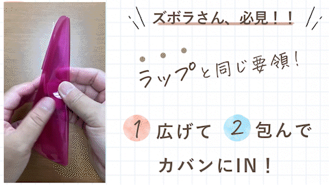 ズボラップの中央に入れたいものを好きなだけ入れてラップみたいにくるっとまとめてカバンに突っ込むだけです!