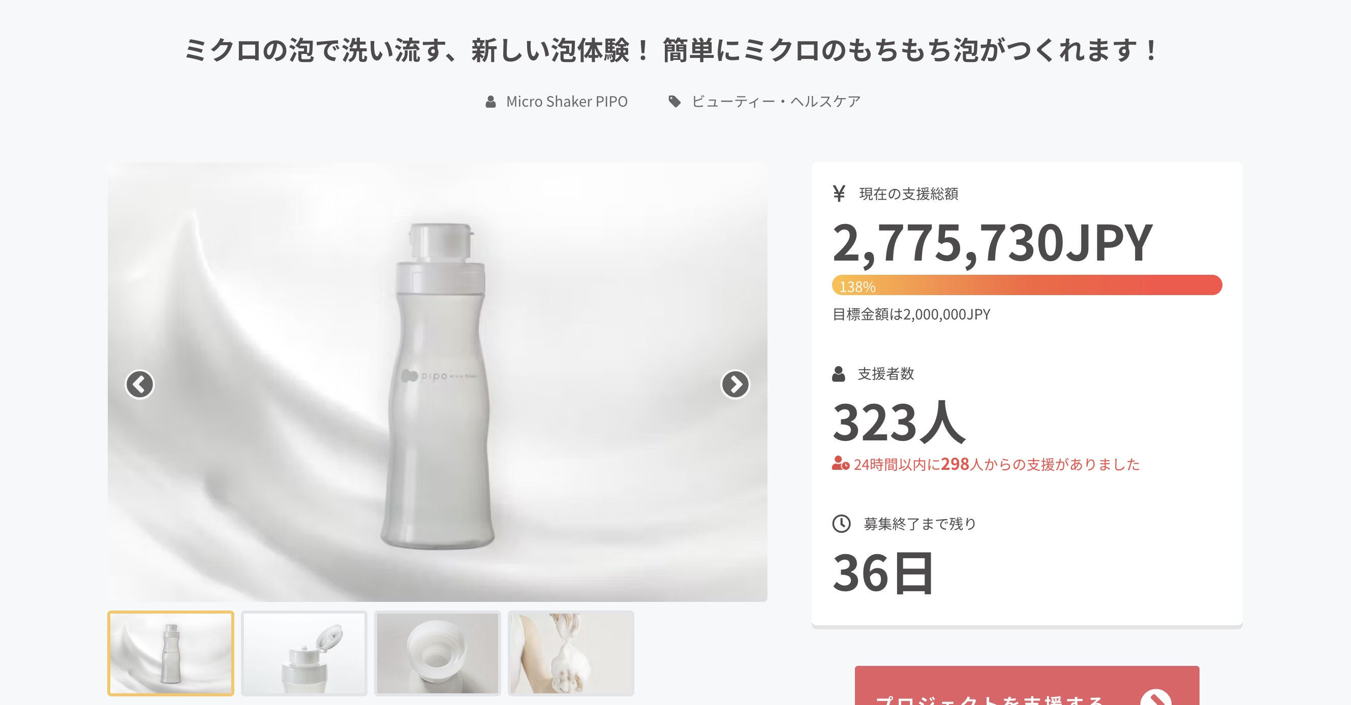 2022/06/20 16:0260 日間のご支援ありがとうございました。わたしたちは4 月20 日より6 月19 日までの60 日間、200万円の資金調達を目標に、クラウドファンディングにチャレンジいたしました。結果、みなさまの大きなご支援をいただき、わたしたちの予想を大きく上回る660 人の方より5,638,810 円の調達を行うことができました。本当に、感謝の気持ちでいっぱいです。今後もこの結果に甘んじることなく、スタッフ一同さらに気を引き締めて、製品( サービス) の更なる向上に向け取り組んでいきます。また、御礼と同時に、これからも末長くPIPO を使っていただきたいため、ほんの気持ちではございますが、取り替え用のキャップを付けさせていただきましたので、ぜひご利用ください。ただいま全スタッフでリターンの発送作業中ですので、PIPOの到着までもう少しだけお待ちください! もっと見る