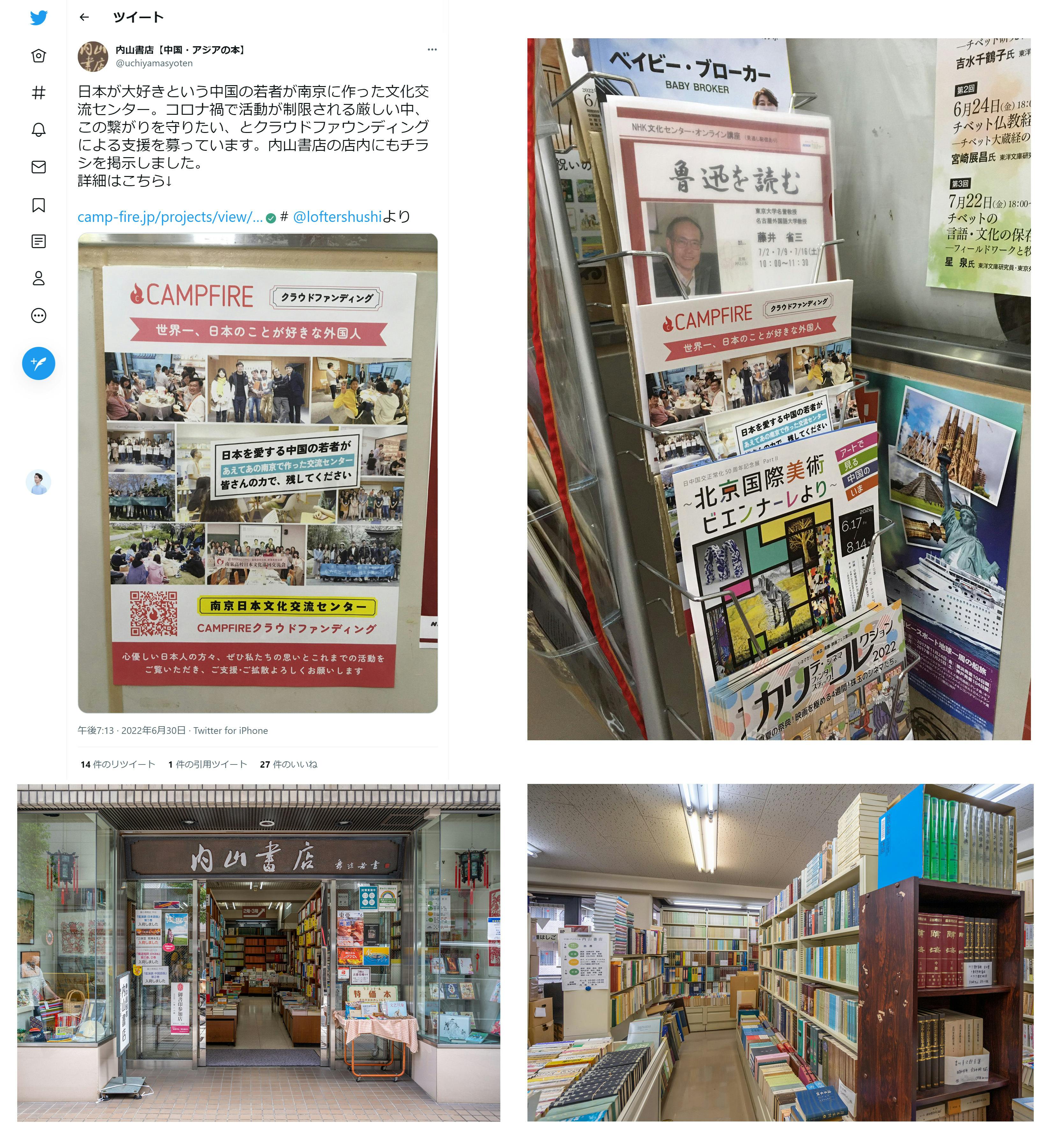 2022/07/03 21:00日中文化人交流に大きな影響を与えた「内山書店」からもご協力をいただいて、私たちの活動のチラシを掲示していただきました。御礼申し上げます。およそ百年前から当時の日中文化人とのつながりを続けてきた内山書店は日中交流推進の大先輩です。皆さまもし神保町に行ったら、ぜひ内山書店にも行ってみてください。本が盛りだくさん! リツイートもしていただいて、本当にうれしいです。→「内山書店」のリツイート内容内山書店について内山書店の創立者である内山完造氏、日本の書店主・文化人。1930年代以降、中華民国と日本の両方で書店経営者として成功し、日中文化人交流に大きな影響を与えた。内山書店は現在も、東京の神田神保町で中国・アジア関連書籍を多く扱っている。取り扱っているのは、日本で出版された中国関係の書籍、DVD、CDなどが約4割。残りの6割は、中国・香港・台湾などから輸入された書籍、雑貨など。ジャンルは問わずあらゆるものを扱い、新刊がメイン。人気があるのは中国語を勉強する人のための教材。ここには中国の子供たちが実際に使っている教科書や参考書なども揃っている。研究者や学生委よりも、ビジネスマンやカルチャーセンターで中国語を習っている人が本を探しに来ることが多い。専門店ならではと思わせるのは、中国の地方都市の地図も揃っていること。魯迅と親交がある内山完造・内山書店略年譜1885年 ( 明治18 )1月11日岡山県後月郡芳井村に、内山完造出生。弟嘉吉は15歳下。1897年 ( 明治30 )12歳秋郷里の高等小学校を退学し大阪の丁稚奉公に出る。以後27歳まで商家の店員として働き、社会の辛酸を体験。1913年( 大正 2)28歳3月下旬、前年に入信した完造は、京都教会牧師牧野虎次の紹介で大学目薬の海外出張員となり上海へ渡航。中国生活の第一歩を開始する。1916年 ( 大正 5)31歳井上美喜 (24歳 ) と結婚。上海呉淞路義豊里に間借りの新居を構えるが、すぐに北四川路魏盛里に移転。1917年 ( 大正 6)32歳魏盛里の自宅玄関先を利用して、妻美喜が小さな本屋を開く ( 上海内山書店の誕生 ) 。1924年 ( 大正13)39歳向かい側の空家も購入し本格的な書店となる。この頃から内山書店は在上海・日中文化人のサロンとなり、やがて「文芸漫談会」が生まれ機関誌『万華鏡』を発行する。中国人メンバーは、田漢、欧陽予倩、鄭伯奇らで、のち郭沫若、郁達夫らも参加。完造は"鄔其山"のペンネームで漫筆を執筆するようになる。1927年 ( 昭和 2)42歳円本ブームにより内山書店は急速に発展。10月広東を脱出して上海に移った魯迅と会う。以後両者の間には深い親交が結ばれる。翌年2月、日本へ亡命する郭沫若を援助。1929年 ( 昭和 4)44歳内山書店は北四川路底に進出。また四馬路に支店 (31年閉鎖)を開いた。翌年に大学目薬の仕事をやめる。1931年 ( 昭和 6)46歳1月左連作家虐殺事件生じ、危険の迫った魯迅を庇護。3月来遊した増田渉を魯迅に紹介。因みに内山完造の紹介で魯迅と面識をえた日本人は、長谷川如是閑、金子光晴、室伏高信、鈴木大拙、横光利一、林芙美子、武者小路実篤、岩波茂雄ら多数にのぼる。8月来遊の弟嘉吉が魯迅の要請で、6日間の版画講習会の講師を勤める。講習会終了後に嘉吉、内山夫妻の養女片山松藻と結婚し帰国。翌年1月第1次上海事変勃発後、魯迅親子・周建人夫妻を庇護するが、日中双方の側から"スパイ"の流言飛ぶ。この頃から、魯迅の著編著などの代理発売元を引き受けるようになった。1935年 ( 昭和10)50歳10月10日嘉吉・松藻夫妻、世田谷の祖師谷大蔵に東京内山書店を開店。11月学芸書院より、魯迅の序文を付した完造の処女出版『生ける支那の姿』刊行。1936年 ( 昭和11 )51歳10月19日魯迅死去( 行年56歳) 。同日葬儀委員会が編成され、宋慶齢、蔡元培、スメドレーらとともに内山完造も委員に選ばれる。同22日万国公墓での埋葬式で、完造は追悼演説を行なった。1937年 ( 昭和12)52歳2月改造社版『大魯迅全集』( 全7巻 ) の第1巻刊行。その編集顧問を勤める。3月東京内山書店、神田一橋に移転。7月7日盧溝橋事件起こり、日中両国は全面戦争にはいる。8月上海での戦火を逃れて、完造夫妻は一時妻の郷里に帰省。9月上京した完造は、郭沫若の日本脱出の件で久松署に4日間検束される。この頃から日本の新聞雑誌に多くの"中国漫談"を執筆するようになる。1938年 ( 昭和13 )53歳4月心臓病の療養で妻美喜は長崎に赴き、同地で長崎内山書店開店 (41年に閉鎖) 。戦争下に内山書店は発展、上海の各所に支店を開く。1941年 ( 昭和16)56歳12月6日太平洋戦争勃発。同15日魯迅未亡人許広平女史が上海日本憲兵隊本部に連行、その救出に尽力。また上海開明書店支配人章雪村、編集長夏丐尊も日本憲兵隊に逮捕され、救出にあたった。1942年 ( 昭和17)57歳対敵資産接収にあった南京路の中米図書公司の管理を委托され、支店として経営。この頃自宅を北四川路横浜路松洞里9号に転居する。1944年 ( 昭和19)59歳1月の横浜事件で閉鎖状態の改造社より、著作の紙型を学芸