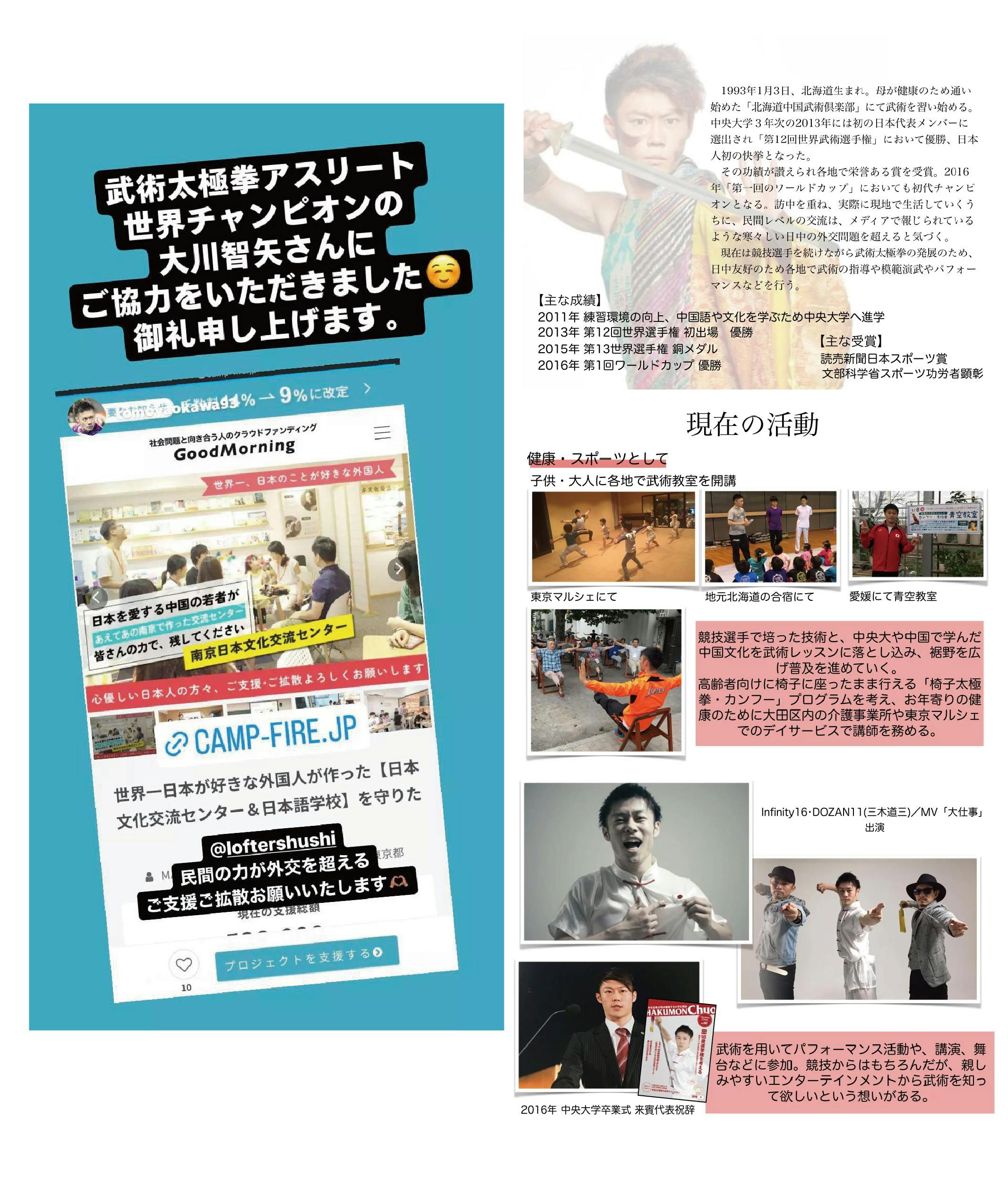 2022/07/31 22:23武術太極拳アスリート/2013・2016世界チャンピオン(日本人初)/日本スポーツ賞、文部科学省スポーツ功労者顕彰受賞の大川智矢様にご協力を頂きました。御礼申し上げます。大川智矢様のご紹介武術太極拳を学び始めたきっかけは、母が健康のために始めた太極拳を、一緒に学びに行こうと思ったら、子供は早く動くカンフー(現在行っている競技)を練習すると言われて、その動きの美しさや俊敏性に魅了されました。人より目立ちたいという気持ちがあったので、誰もやっていない種目に惹かれました。自分の元々の夢は中国と日本の外交官になることでした。全日本代表入りをし、何回も合宿で訪中を重ねていくごとに、実際に生の中国人と触れて、日本で報道されているような寒々しい中国との関係は政治的な問題のみなのだと実感しました。自分が武術を通して生の中国人と接することで、民間レベルの交流が外交を超えてしまうのだと強く感じました。中央大学で勉強した中国言語文化と、実際に訪中を重ねて得た中国の良さを、日本人の皆さんに伝えて日中友好の架け橋になりたいです。 もっと見る