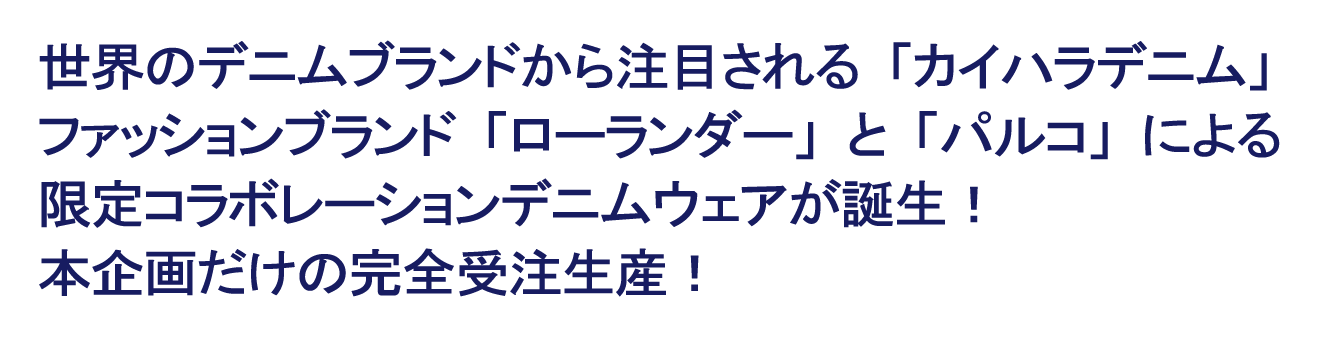 世界のデニムブランドから注目されるデニム生地のプロフェッショナル「カイハラデニム」、リメイクを中心に活動するファッションブランド「ローランダー」。この「カイハラデニム」「ローランダー」と「パルコ」の3社が企画制作した限定コラボレーションデニムウェアの受注会を開催いたします。今回ご用意したアイテムはパッチワークを施したデニムシャツです。3種類のデザインからお選びいただくことができ、完全受注生産のため本企画のみで購入することができる限定商品となります。