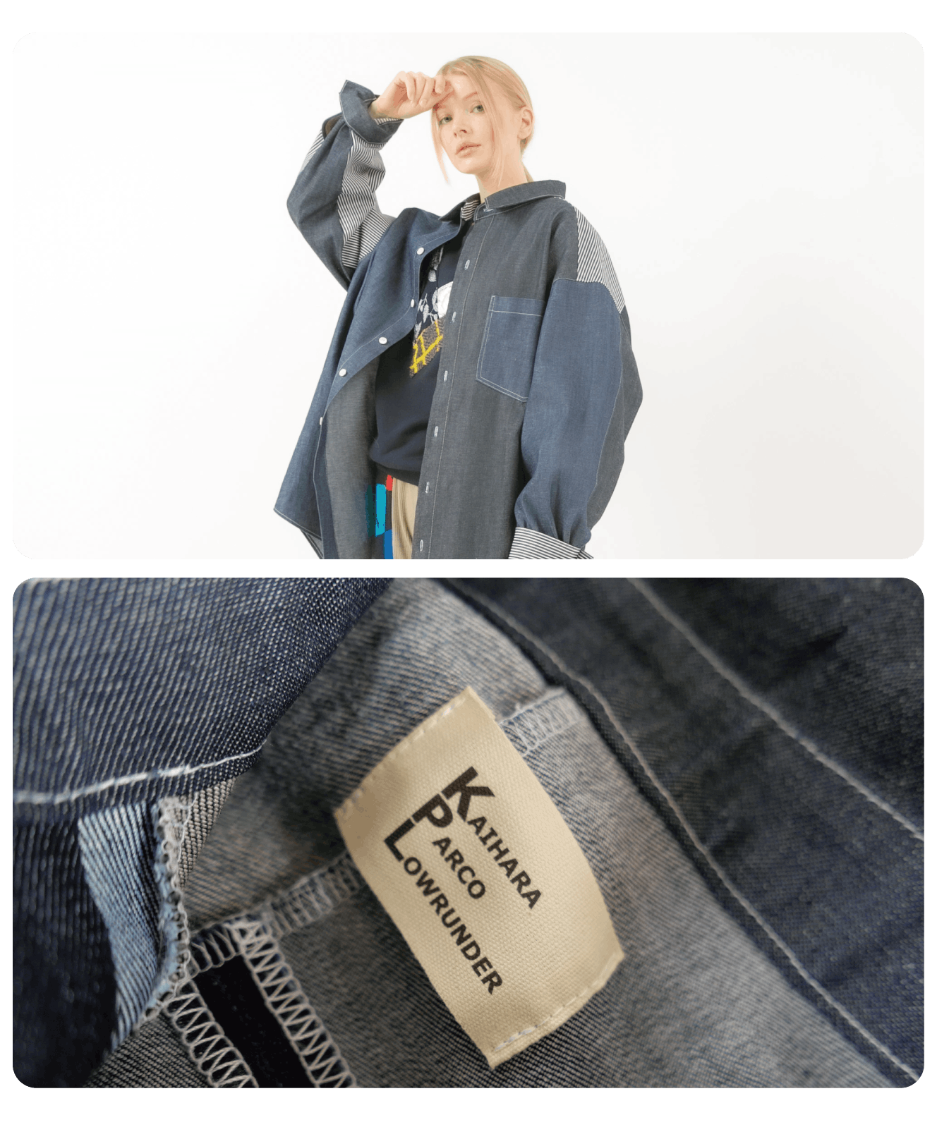 リメイクを得意とするデザイナー「ローランダー」の、真骨頂とも言うべきデザイン。カイハラデニム提供の生地見本ストックを最大限に活かし、デニムが見せる様々な表情を1着のシャツに折り込む、究極のアップサイクルファッションです。
