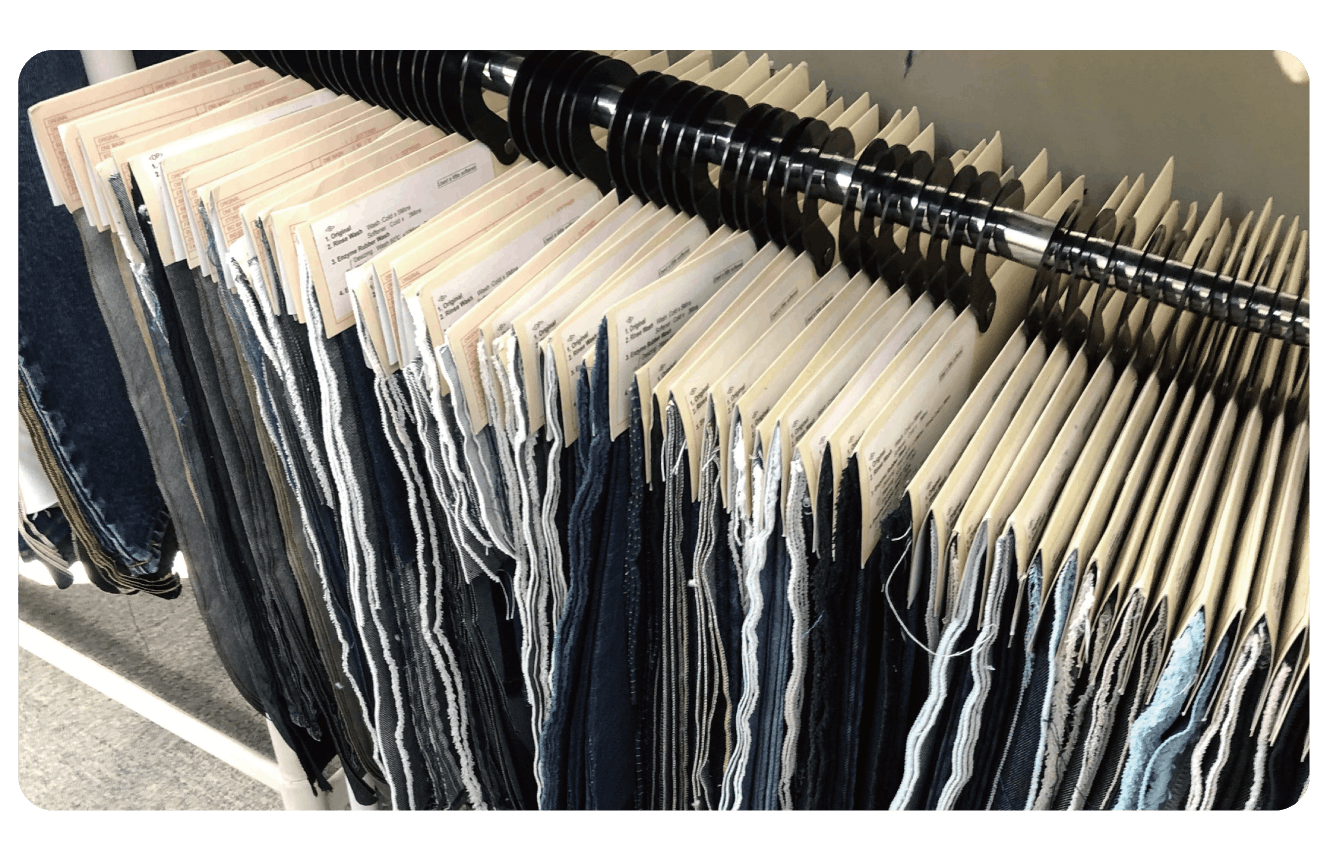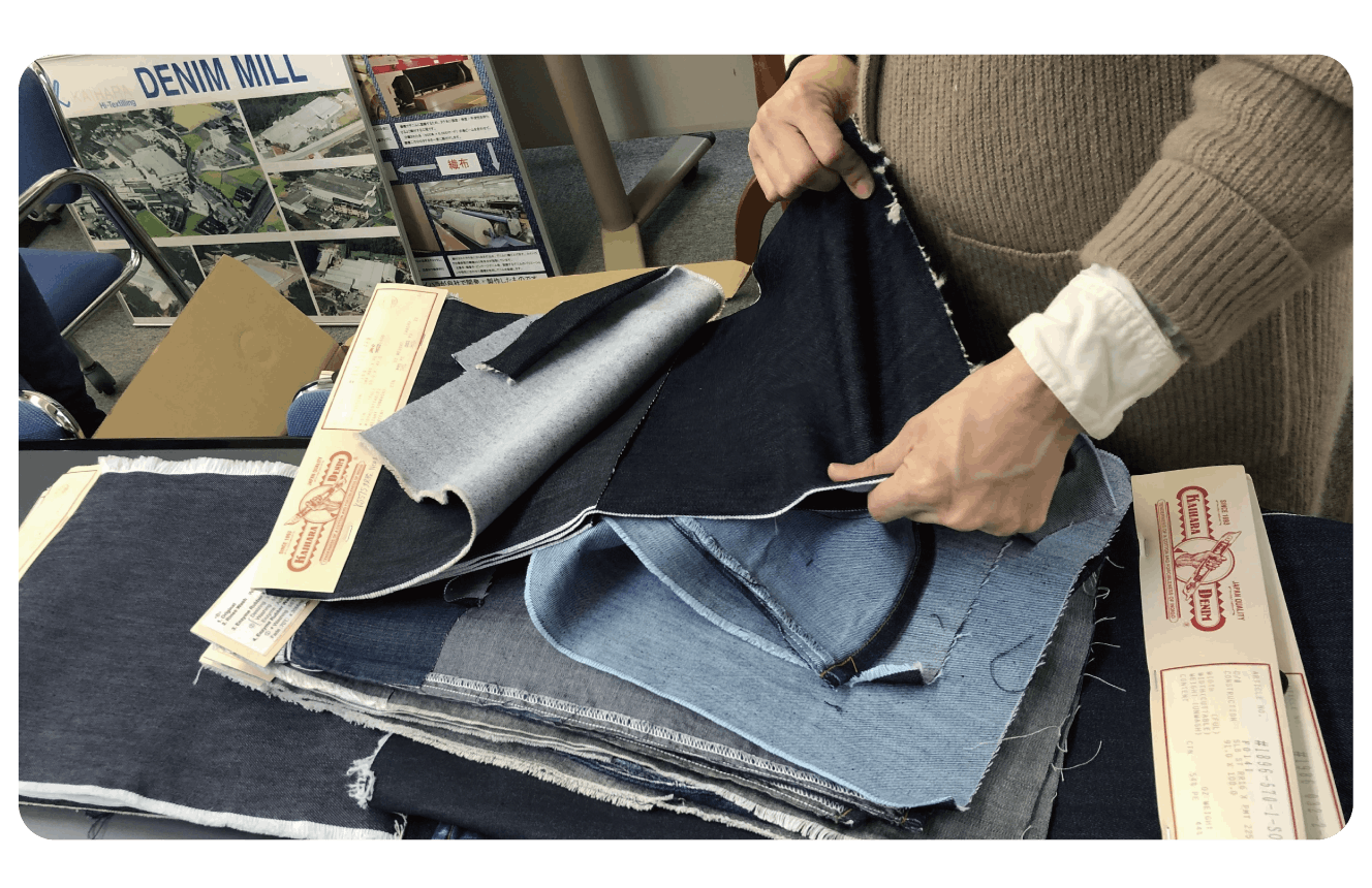 そしてカイハラデニムからは、驚きの提案が飛び出しました。それは、「カイハラデニムがお得意様と商品作りをする際に使用してきた膨大な生地見本ストックの一部を、今回の商品開発に特別に提供する」というものでした。「これなら、いろんなバリエーションのデニム生地を使って、商品作りができる。」デザイナー ローランダーの商品制作に対する意欲も高まりました。そしてカイハラデニムから商品作成用のデニム生地が到着してローランダーは商品サンプルの制作にとりかかり、ついに3社のコラボレーションデニムウェアが完成しました。