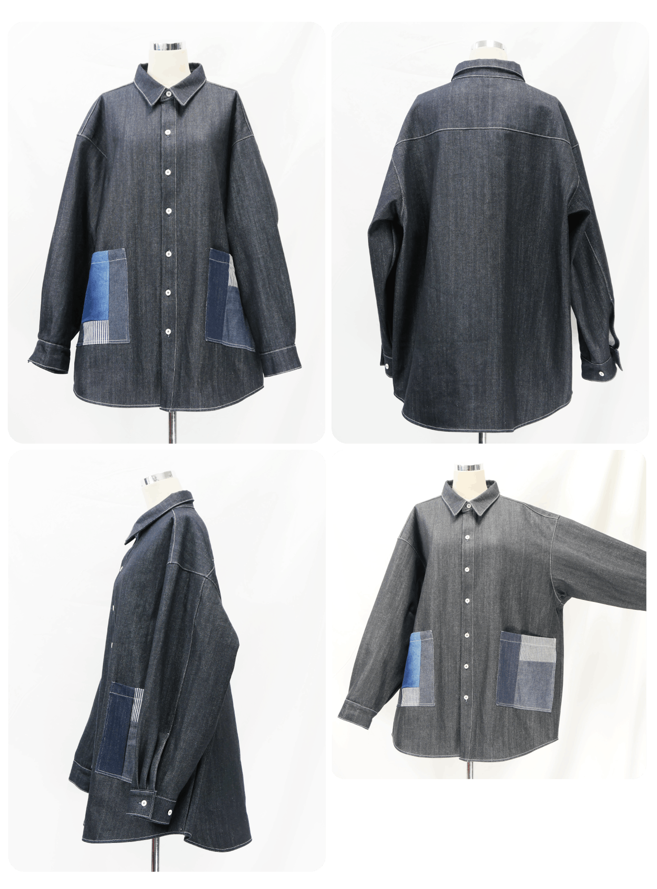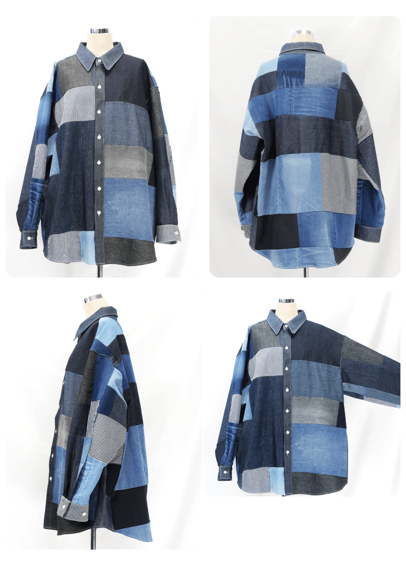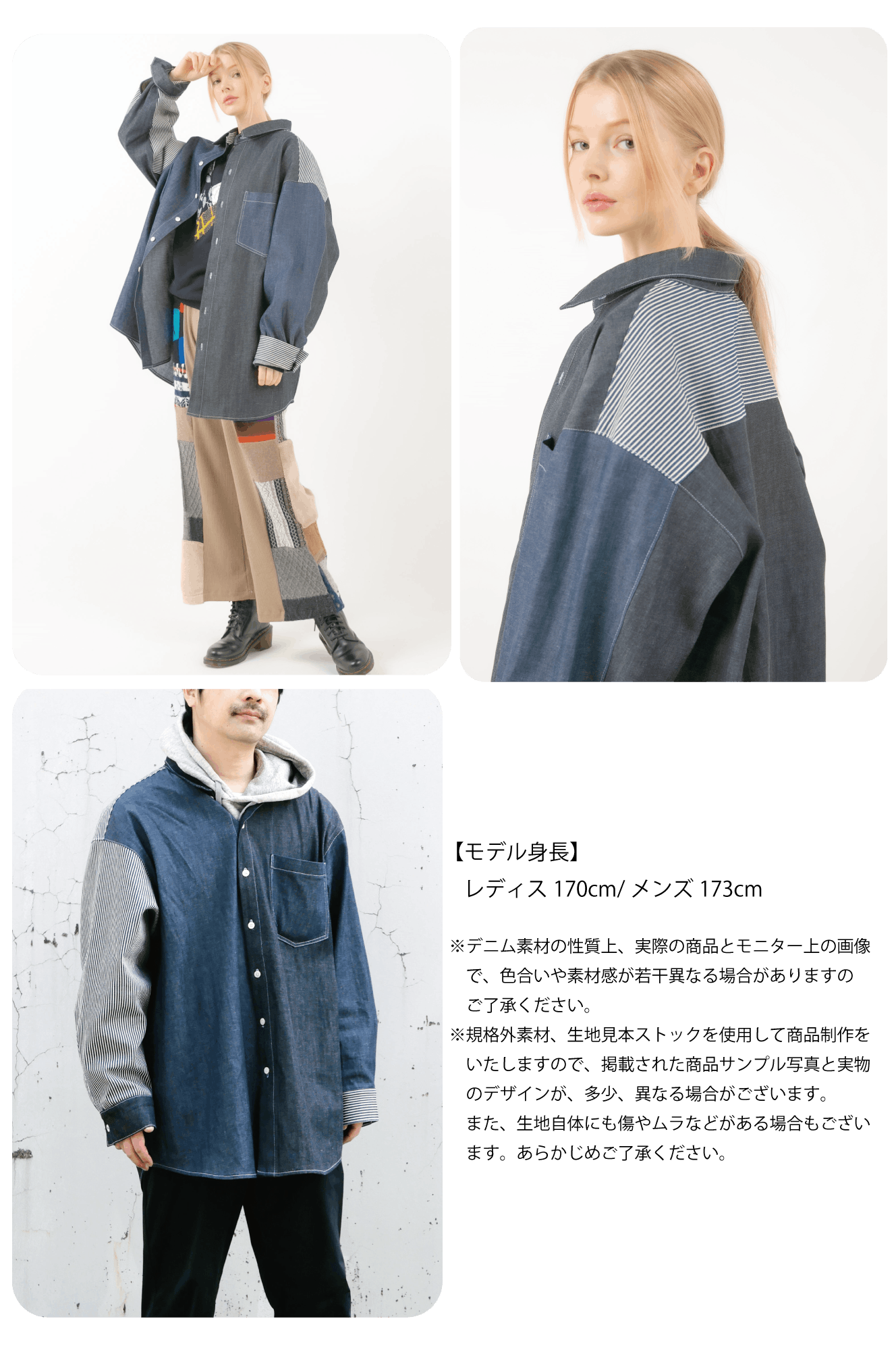 今回の商品内容としては、2022秋冬に対応した、アウター想定のデニムシャツで、ユニセックス/ノンエイジ、オーバーサイズのM・L 2サイズ、デザインは3種類 のパッチワークで展開。