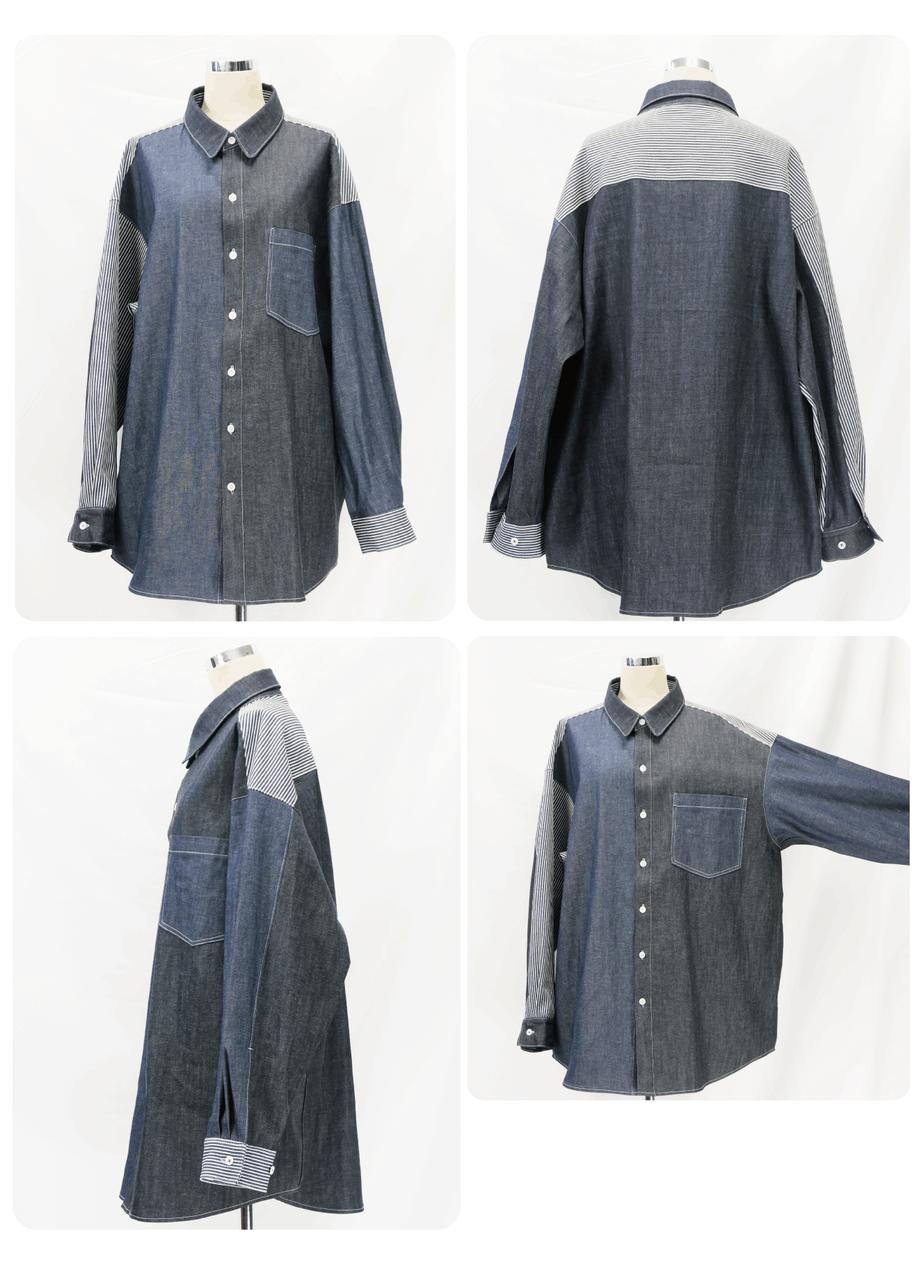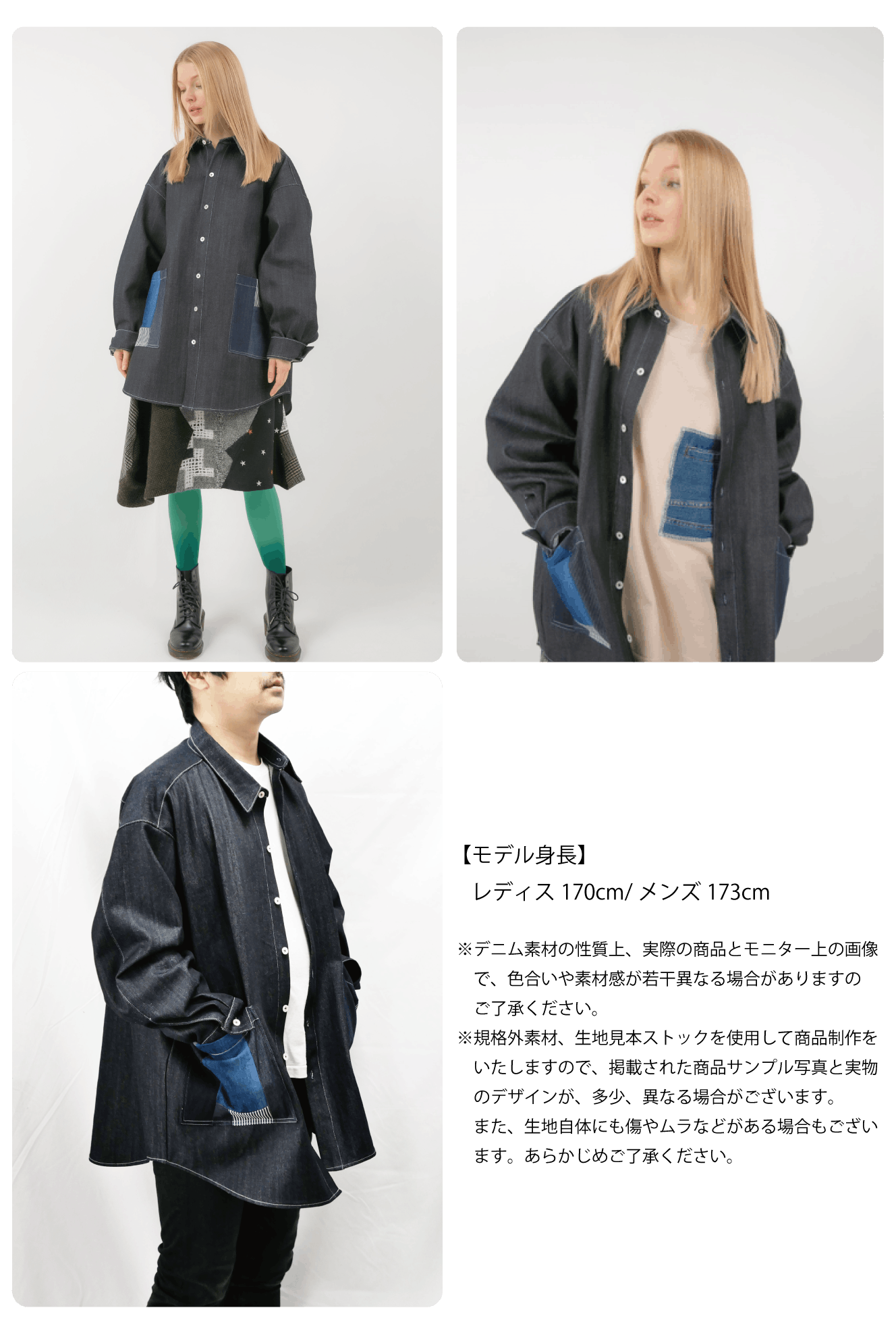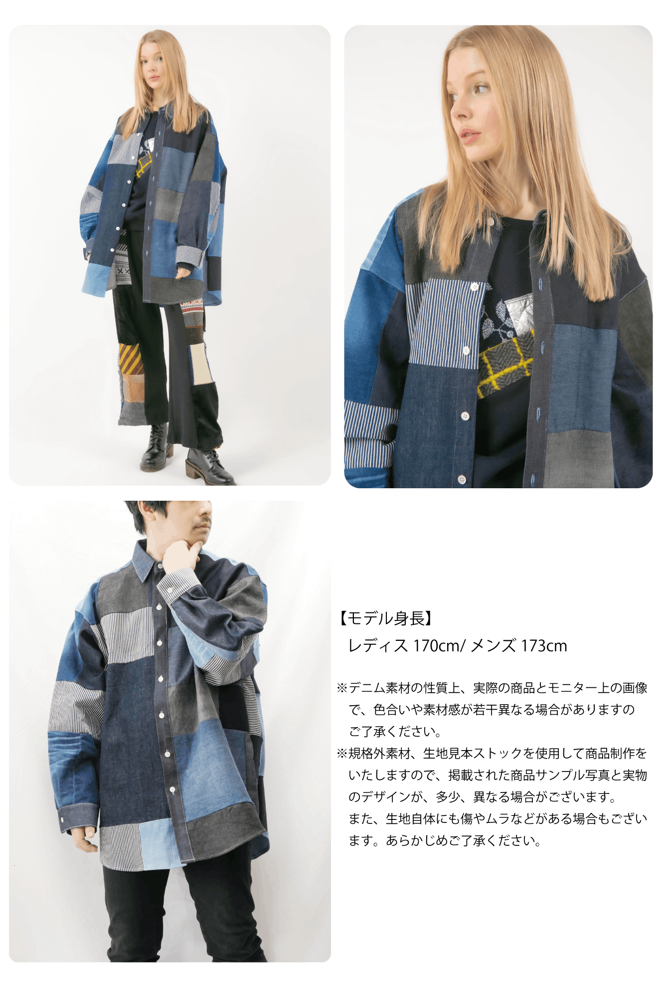 今回の商品内容としては、2022秋冬に対応した、アウター想定のデニムシャツで、ユニセックス/ノンエイジ、オーバーサイズのM・L 2サイズ、デザインは3種類 のパッチワークで展開。