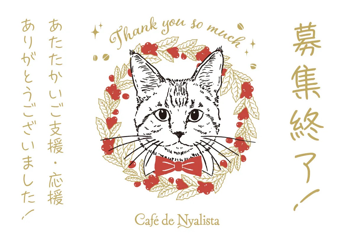 2022/07/11 00:04皆さまのサポートのおかげで、このプロジェクトは成功という形で幕を閉じることができました(='ᆺ'=)!!しかも当初の目標である30万を超え、達成率200%以上という結果になり、「かわいいと思った人(自分)がいるんだから、他にも共感する人がいるはず!」「その想いはたくさんの人に届くはず!」と始めたこのプロジェクトですが、これだけの方々に届き、ご支援や反応をいただけたことが素直にとてもとても嬉しいです。ご支援いただきました皆様はもちろん、SNSで情報の拡散を手伝していただいた皆様、チラシをお店に置いていただきました皆様、イベントにてチラシを快く受け取っていただきました皆様…関わっていただきました全ての皆様に心から感謝いたします。本当にありがとうございました!リターンにつきましては、現時点では8月初旬より準備が整い次第発送の予定です。状況が確定次第、随時ご連絡していきますので、もうしばらくお待ちください。今後ともよろしくお願いいたします(='ᆺ'=)♪Café de NyalistaTwitter:https://twitter.com/nyalista もっと見る