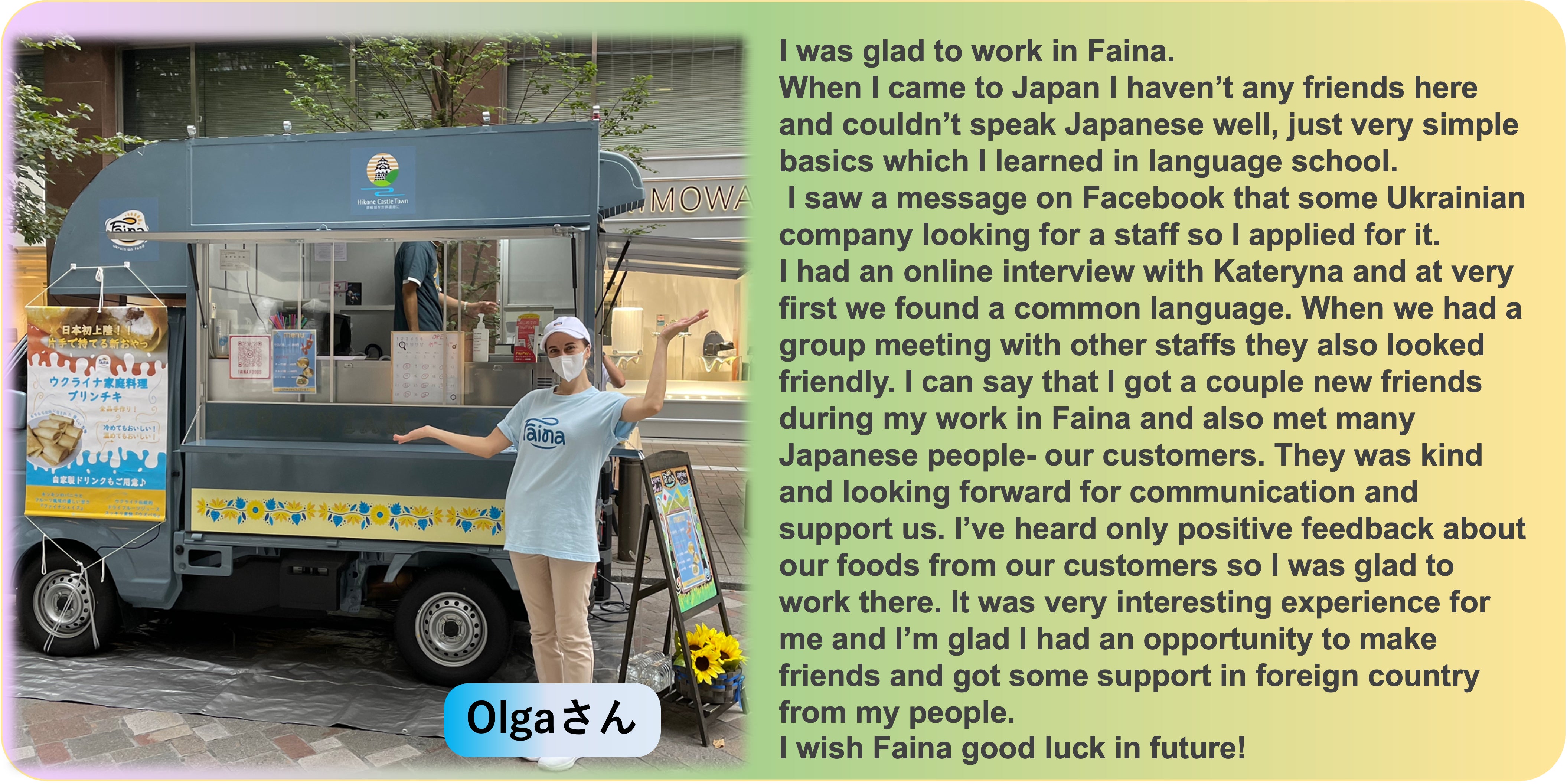 来日当初は、暗い表情が多かったイリーナさんや他のFainaのウクライナ人スタッフが、Fainaで働く中で見違えるほど明るくなっておりました。毎日のように、日本人(お客さんやスタッフ)や日本の街、自然、建物、お祭り、食べ物などの文化と密に触れ、理解が深まり、日本のことを好きになっていったと言います。