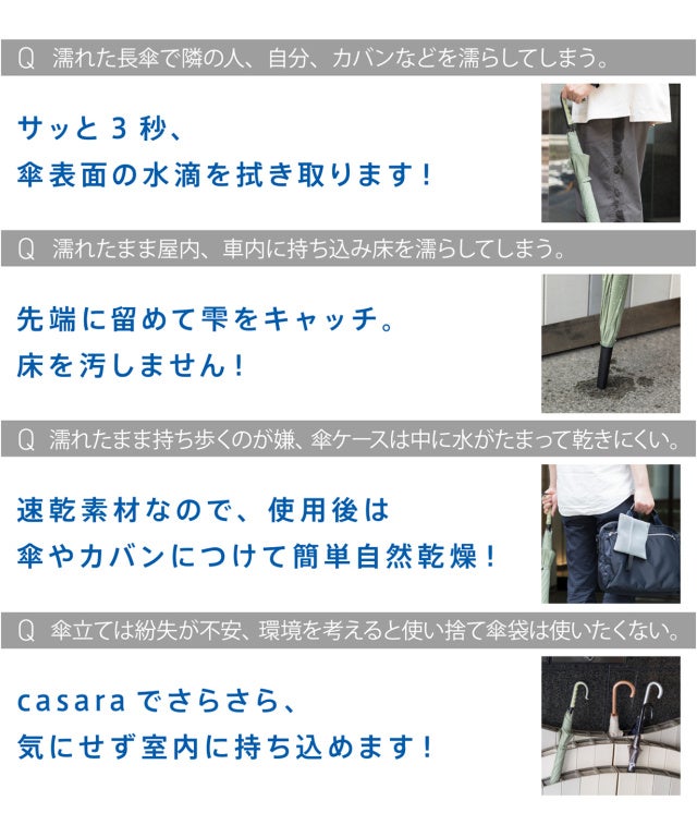 3秒で水滴拭き取り。自動車・電車内や屋内でも長傘さらさら casaraCMS