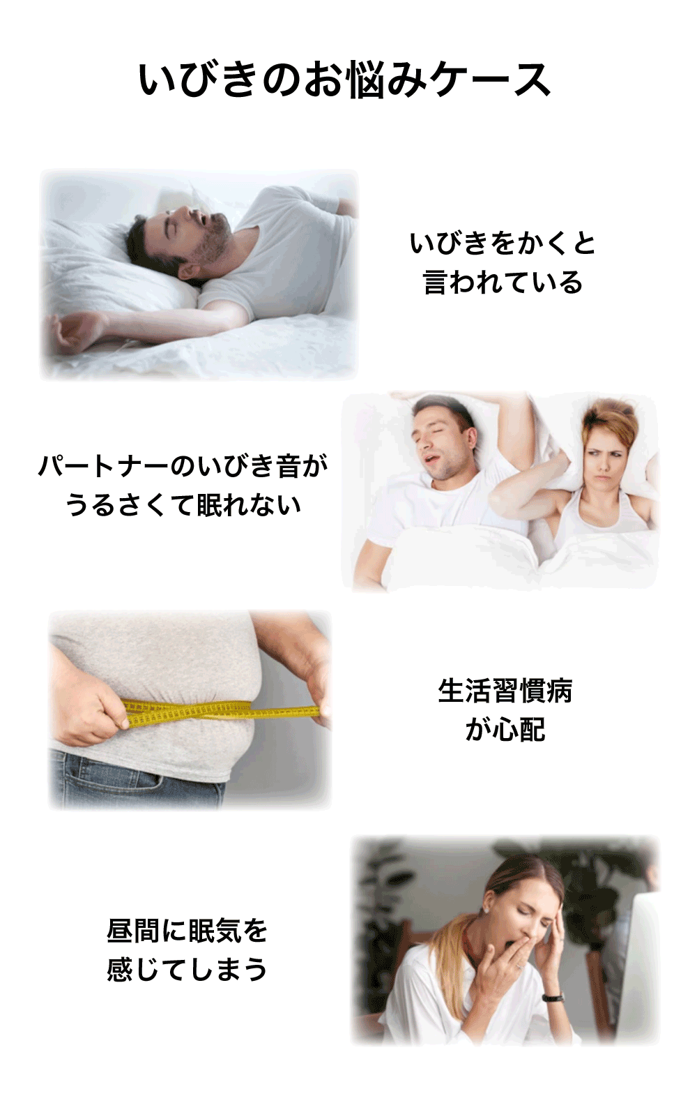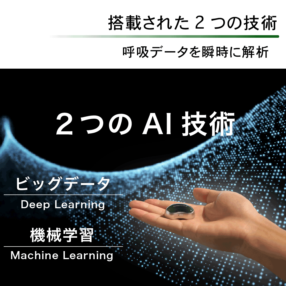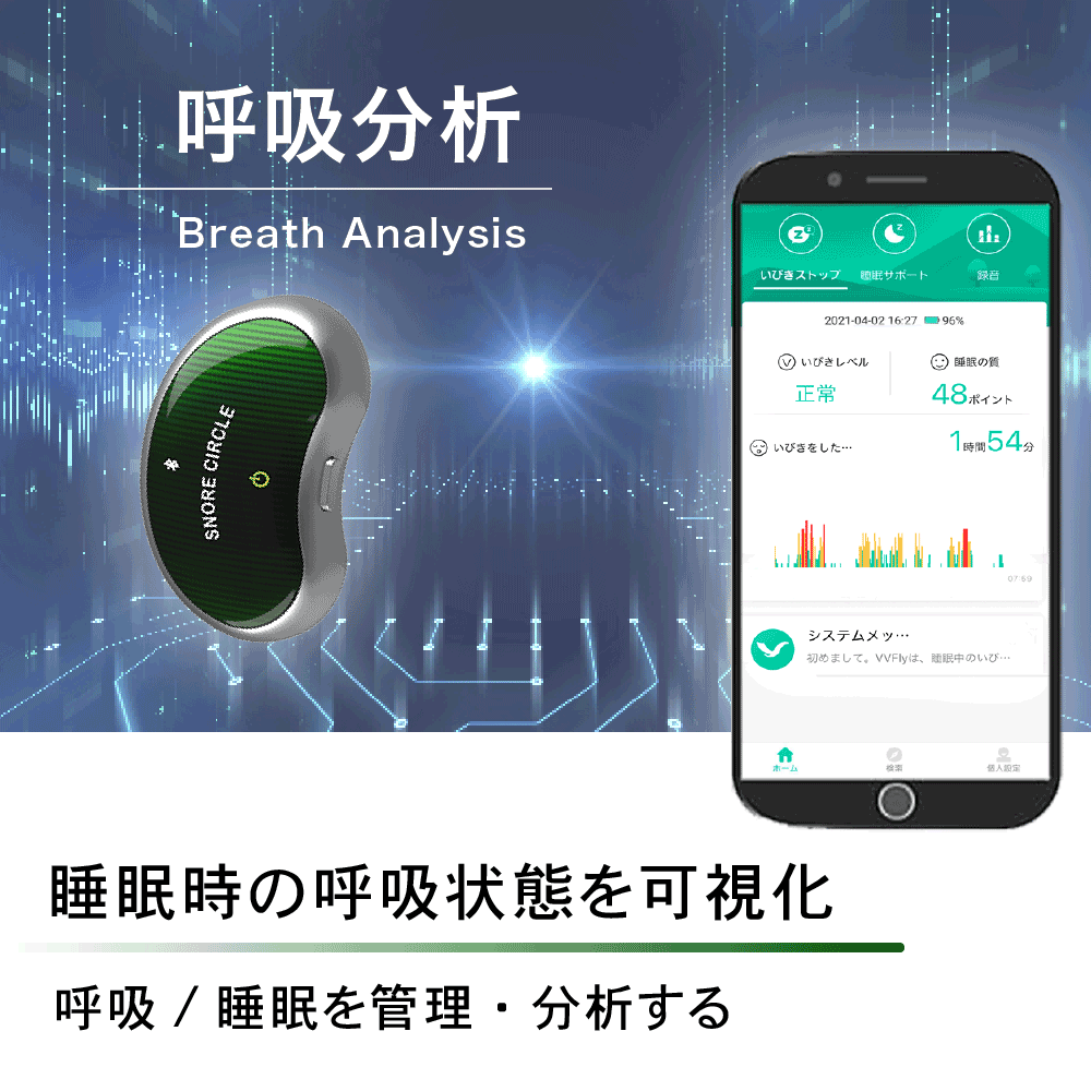Snore Circle PROは、ビッグデータ解析の機能追加によって「いびき」だけではなく「呼吸レス」状態も見つけることが可能になりました。いびき同様に発見すると、微弱な振動刺激を発信し、ケアを行います。