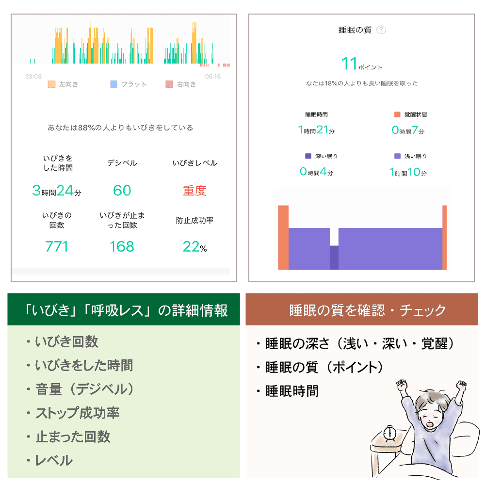 いびきをした回数や、音量、ストップ成功率など、睡眠時の呼吸状態を確認することができます。