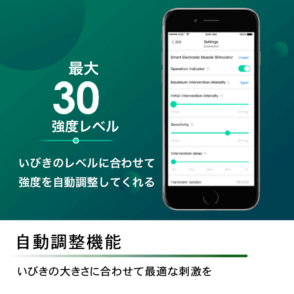 スマートフォンアプリによる細かい設定などを行わなくても、本体が自動的にご利用者のいびきレベルに合わせて刺激を調整します。