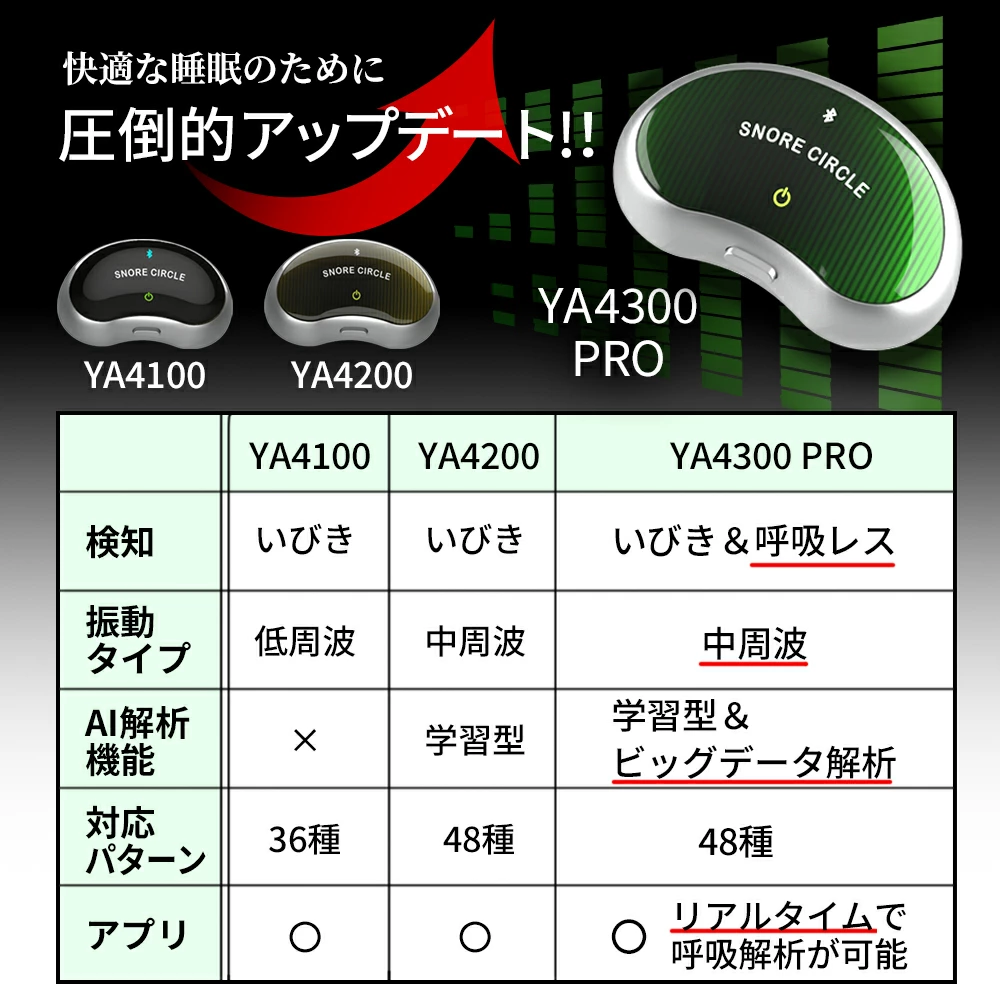 Snore Circle PROは、瞬時に何万件ものデータと照合し、呼吸状態を解析する「AIビッグデータ解析」機能が加わったいびきケアグッズです。