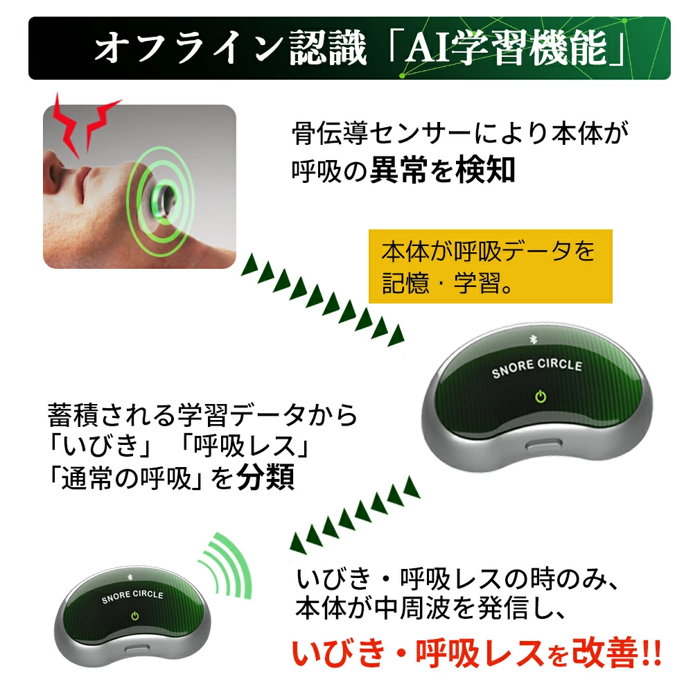また機械学習機能によるいびきケア機能も搭載されていて、こちらは通信がない状態でも本体のみでいびきケアが可能です。