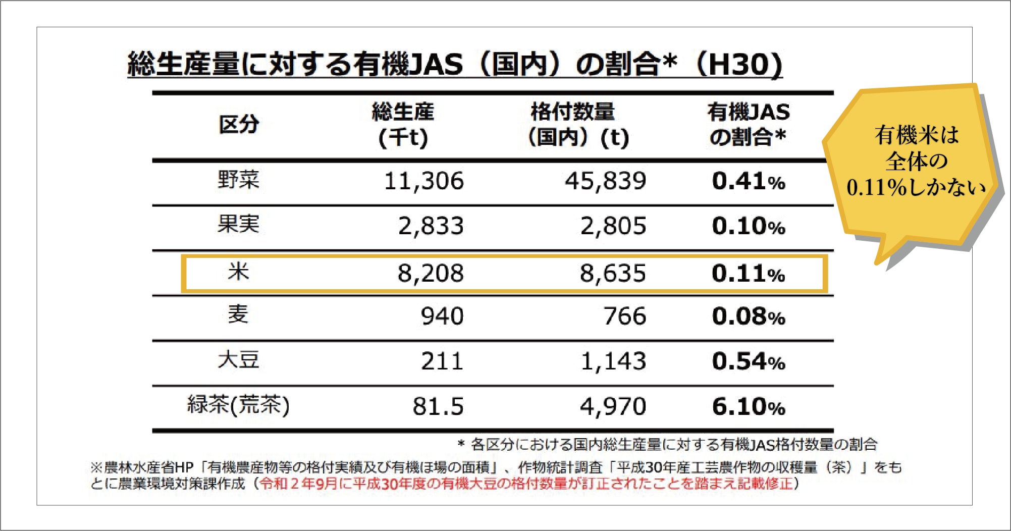 お米の場合は、農薬を使用せず(有機JASを取得して)生産されたお米は全体の生産量のうち、たったの0.11%というデータが出ています。(図1 令和2年9月29日更新 農林水産省生産局農業環境対策課「有機農業をめぐる事情」より)