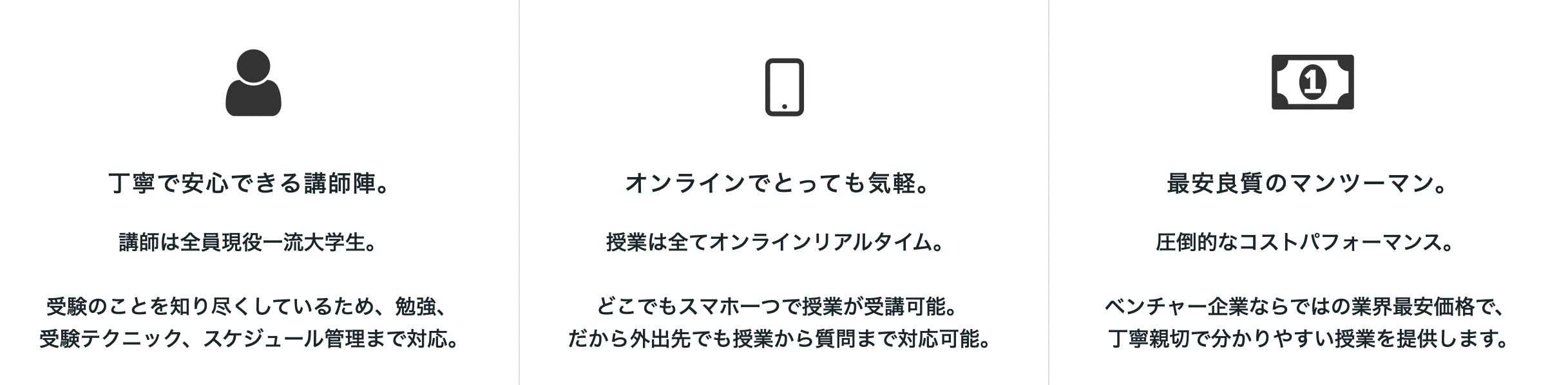 大手予備校や個別指導塾に通わせたいけれどお金がない、地方でも都市圏の高偏差値の大学に通う講師の授業を受けたい、登校時間を削減したい、生徒と講師が非常に近い環境を選びたい。