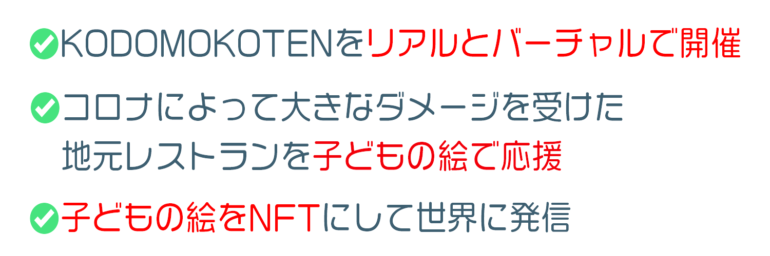 2022/08/31 18:54日本初!子ども絵画展-KODOMOKOTEN-がリアル&メタバースのハイブリッド開催。NFTで作品の販売も可能に。KODOMOKOTENが8月31日夜21時に終了となります。来場くださった皆様ありがとうございました!夏休み!子ども絵画展 - KODOMOKOTEN -開 催 期 間 : 2022年8月1日〜8月31日リアル開催場所 : 札幌もいわ山山頂レストラン THE JEWELS(ザ ジュエルズ)営 業 時 間 : 11:30〜20:00ラストオーダーInstagram : https://www.instagram.com/jewels_restaurant/メタバース会場 : GAIA TOWN内のイベント専用会場 24時間(最終日は21時まで)2019年に札幌創生スクエアにて開催したのをキッカケに、定期開催の予定で始まりましたが、コロナの影響により個展自体の開催ができない状況となりました。その際にもクラウドファンディングにて、94名もの方にご支援いただき、お約束が守れずに悔しい思いをしておりました。3年が経った2022年はこの経験を踏まえて、リアル&バーチャルにて開催することになりました。メタバース、NFT、バーチャル・・・・。まだまだ、認知されていないこの環境の中でどれだけのことができるのか、未知の世界の中飛び込んだのです。そんな厳しいと思われる環境の中で、2回目のクラウドファンディングにて84名もの方がご支援いただいたのです。この1ヶ月子どもたち(アーティスト様)の作品に対する想いやストーリーをお聞きして、大人のわたしたちの気持ちにたくさんの火をつけてくれました。リアルとバーチャルで開催する中で、支援者の皆様に何をお返しできているのか?もっと、還元できることがなかったのか?チームメンバー(TEAM KOKODAO)は、葛藤を抱くばかりでしたが、これを踏まえて、冬休みも開催できるようにKODOMOKOTENを成長させていこうと考えております。 最終日8月31日20:00より マネージャー八幡えいこのFacebookにてライブ配信をいたします!お時間ある方はガイアタウンにてお会いしましょう!八幡えいこ Facebook▽入場方法はこちら!パソコンからどなたでも入場いただけます。①ガイアタウンのはじめかた ②ガイアタウンをダウンロード準備ができましたら、ログインします。1)左上にある「次に移動する」をクリック。2)Private Roomをクリック。3)パスコードを求められます。パスコード 「 3BXrbHNBr9 」を入れて送信。こちらで、入場できます。ーーーーーーーーーーーー▽KODOMOKOTEN LINE公式▽Twitter▽TikTok▽YouTube もっと見る【NFT勉強会開催】支援者様限定となります。