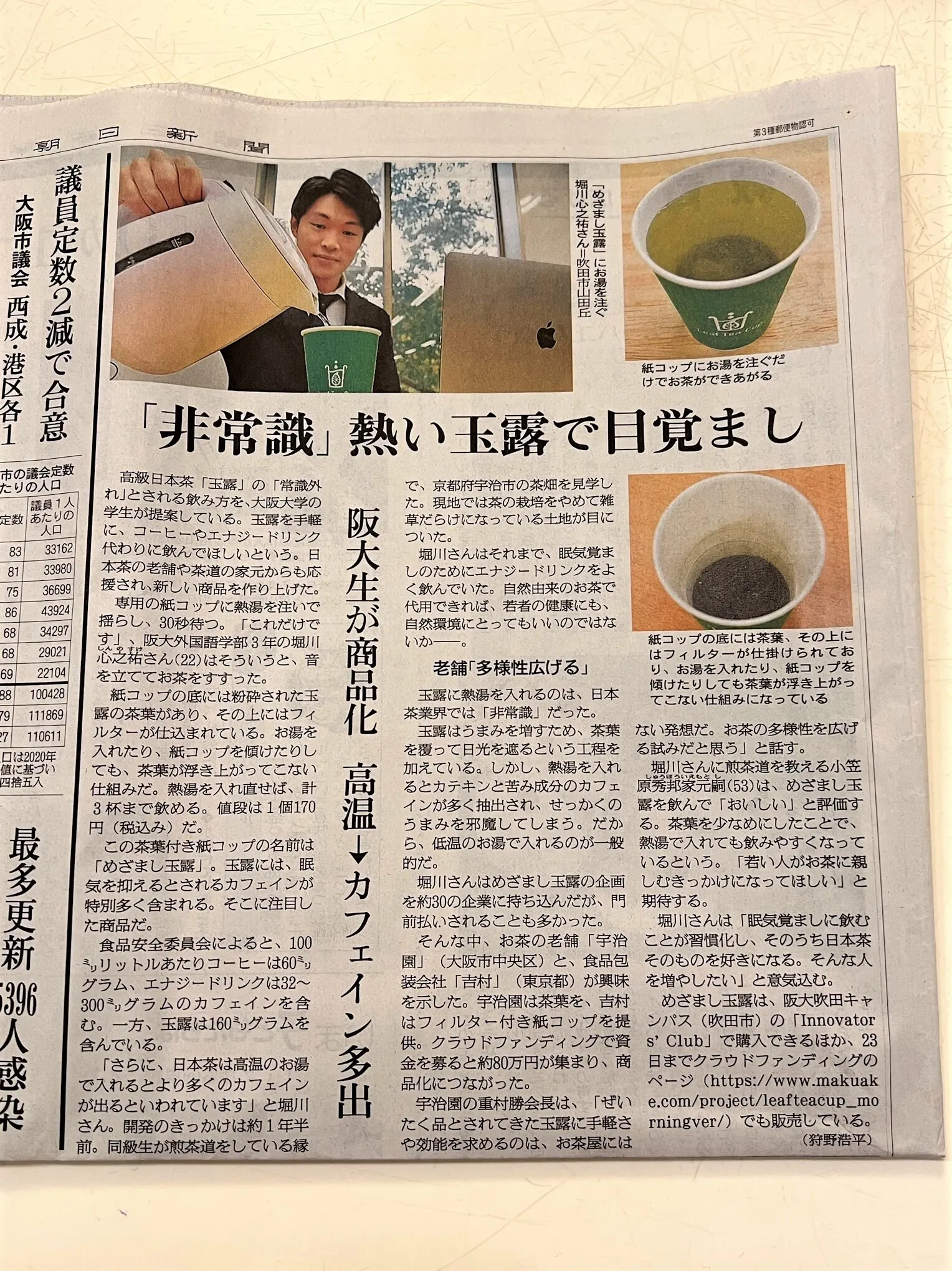 茶葉に親しんでもらおうと阪大生が開発した茶葉入り紙コップを朝日新聞に取り上げていただきました。