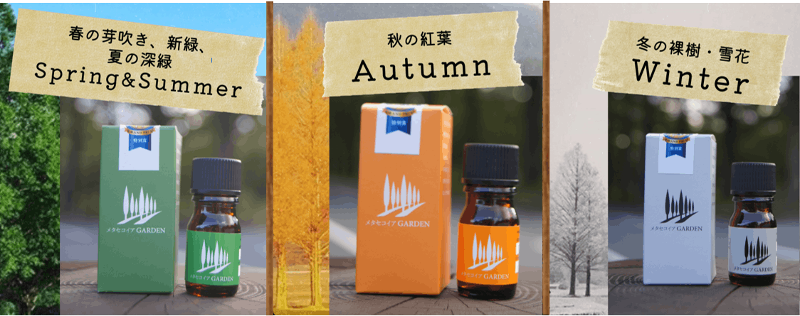 春夏・秋・冬 3種類の香りをメタセコイア並木道の香りとしてイメージし調香しました。