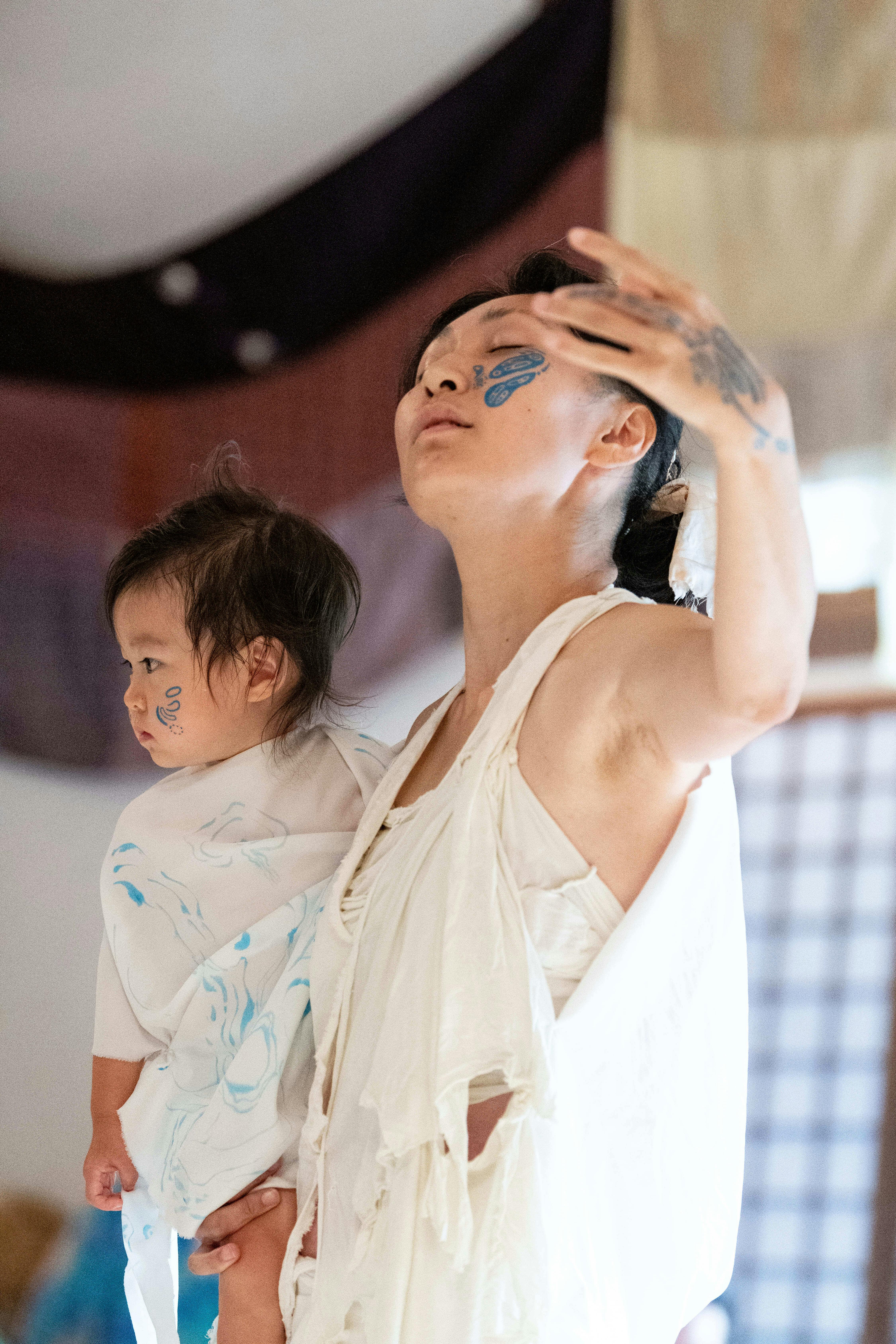 2022/06/28 10:00こんにちは鈴木 彩花です。今回の活動報告は昨年パフォーマーとして参加した実験躰ムダイさんと、当時1才の娘のルカちゃんが原始感覚美術祭で体験したお話です。わたしはムダイさんとルカちゃんにボディペイントをしてコラボレーションしました。ムダイさんから聴いたお話をわたしの目線も交えてお届けします。それではどうぞ。────────お腹にルカちゃんが宿ってから身体を大切にしつつ臨月までお腹の中の生命とともに舞台で踊り続けてきたムダイさん。ルカちゃんが産まれてからも舞台の上で、時にあそびながら時にあやし乳をあげながら一緒にパフォーマンスをしてきました。踊りながらすくすくと育ってきたルカちゃん初めての子育てのなか娘のことを本当に想いたくさんのことを考え試行錯誤してきたムダイさんは東京で暮らすなかでルカちゃんがテレビやスマホが好きで離れないことや食が細いことを心配していました。断乳した方が、ご飯をもっと食べるのじゃないか?という、周りのアドバイスもありルカちゃんのために、断乳に踏みきろうかと考えていたこともあるなか原始感覚美術祭に誘われパフォーマンスをしにきました。2021年は火おこしの儀・宵祭り・本祭りと3日間のお祭りがありました。長野の山々を眺め、空気を吸い木崎湖の雄大な水に触れあそんだり昔ながらの木ともぐさでの火おこしを体験し不思議な存在もののけのような獅子舞たちが踊る姿に驚き泣いたり千年の森での山道を母子ぴったりくっつき登り降りして作品を鑑賞したり太鼓の鳴る音を聴き山車を引いての木崎湖一周でみんなと練り歩くなか最後ルカちゃんは両手を上げ下げしながらみんなと一緒に笑顔で踊っていました。そうした時間を過ごしてから迎えた最終日、本祭りでの即興パフォーマンス準備の段階で、ムダイさんにボディペイントをしているときにルカちゃんがじっと見ていてときどき指をさし「あ!」と話す姿が印象的でした。本番がはじまり抱かれて登場したルカちゃんの顔は凛と澄んでいてムダイさんと一体となっていました。場には静謐な空気がうみだされそのなかで、徐々に轟くように鳴り響く永井朋生さんの演奏があり佐々き み菜さんもひとじゃない生き物のように同じ場で踊るなかルカちゃんは一度も泣かずじっと前を見据えていました。パフォーマンスが終わったあとムダイさんが驚いた様子で言ってくれたことルカちゃんが、はじめてパフォーマーの顔になった。さまざまなパフォーマンスや作品を、3日間通して観て場の空気を体感してムダイさんが研ぎ澄まして 入り込みたい今回の踊りの流れも感じて「わたし、できるよ!ママ」と言ってくれているようなどっしりとした頼もしさを感じた。と。パフォーマンスをやる前は泣くこともあるかもしれない。と共演者と相談していたムダイさん。泣いたら泣いたで、それが自然な姿だから泣いてるのをみんなで見守るのもよいのじゃないかと伝えてくれた永井朋生さん。ちいさな存在がその場で思う存分自分の感覚を生かし在れること泣いてもよいし自分を試してもよい。さまざまな表現をするひとたちがいるなかで、何を感じとるかは本当に自由で自分が感じとったことから何がうまれてくるのか。体験しておもいもよらぬものがうまれてくることもあるとおもいます。まだ知り得ぬ自分や関わりあったからこそうまれるさまざまなこと。土地の自然や、ひとさまざまな生きものたち音、空気、水すべてを感じとり生きれること。祭りが終わってからムダイさんと話したことはルカちゃんが長野にきてからもりもりご飯を食べお乳もたくさん飲むようになったこと。しっかり排出もしてあるときからスマホをポイと手放したこと。この世は、たくさんの刺激やおもしろいものであふれていて虫や、草や、湖や不思議な表現者たち出逢ったものたちがルカちゃんのなかでどのように存在して光っているのだろう。今年2歳になったルカちゃんはよくしゃべるようになり「踊らない、見てる!」と言ったり「やっぱり踊る」と言ったりするそう。そのひとつひとつの姿が今を生きていてとても心地よいなぁとおもいます。ルカちゃんや、ムダイさんやひとりひとりの姿から感じて、学ぶことがたくさんあり嬉しくおもった出来事なのでした。個人的に、泳げなかったムダイさんが最終日、木崎湖に飛び込んでいる姿にも感動しました。たくさんのものをはぐくむ世界。さて今年は、どんなものがうまれてくるのかどきどきと 心踊っています。自分が何を見て 何を感じるのか未だ知り得ぬものを感知し、歩んでいけることがこの世界の醍醐味のひとつなのだとおもっています。鈴木 彩花https://www.instagram.com/tenohirayaka/実験躰ムダイ & ルカ https://www.instagram.com/8mudai8/ もっと見る