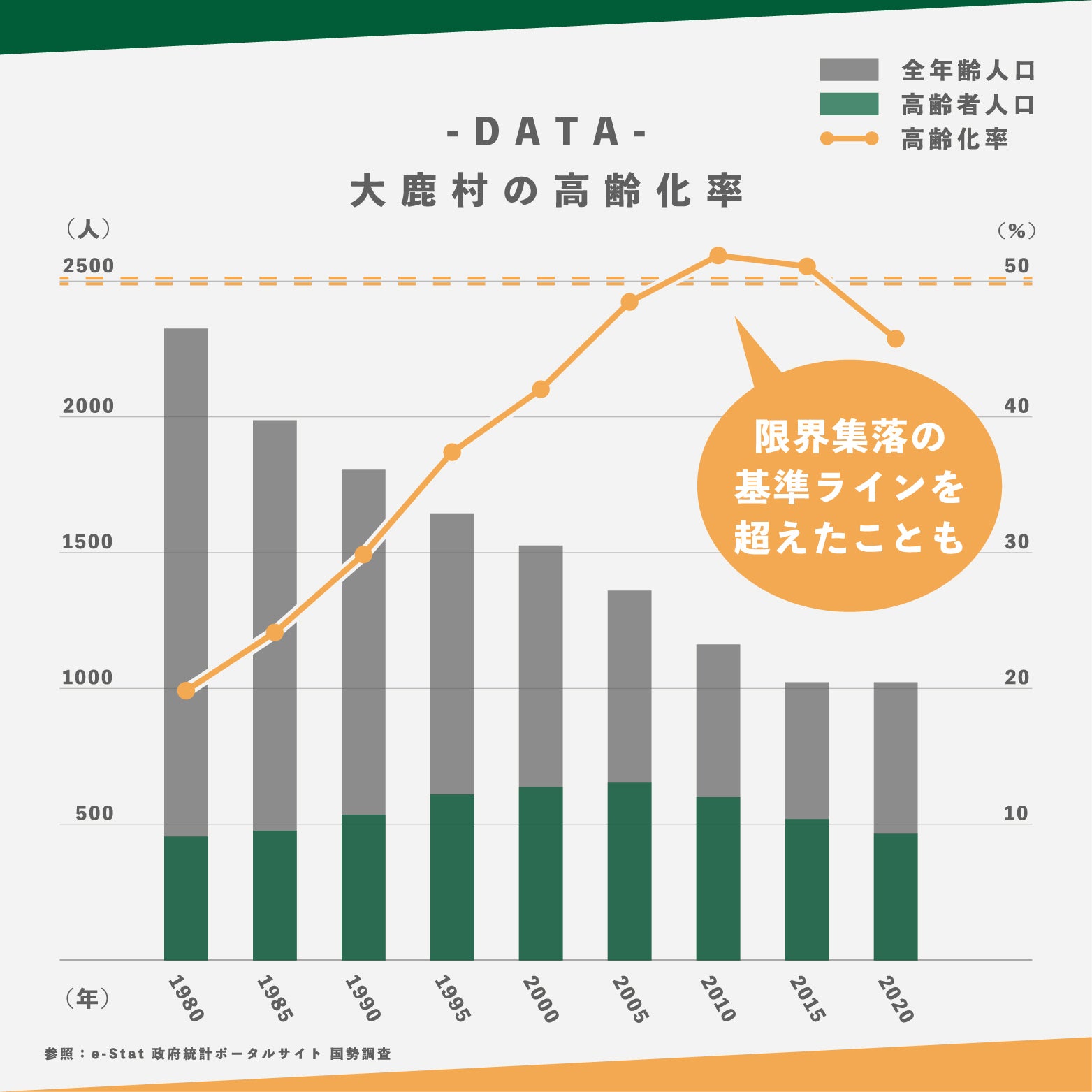 高齢化率は少し持ち直しましたが、将来的には限界集落の基準である【65歳以上が50%以上】となる見込です。村の人たちはここでの暮らしを楽しんでいますが、年々、村の平均年齢が上がり、人口が減り、お店が減り、観光客が減り…。ちょっと暗い話題が増えています。