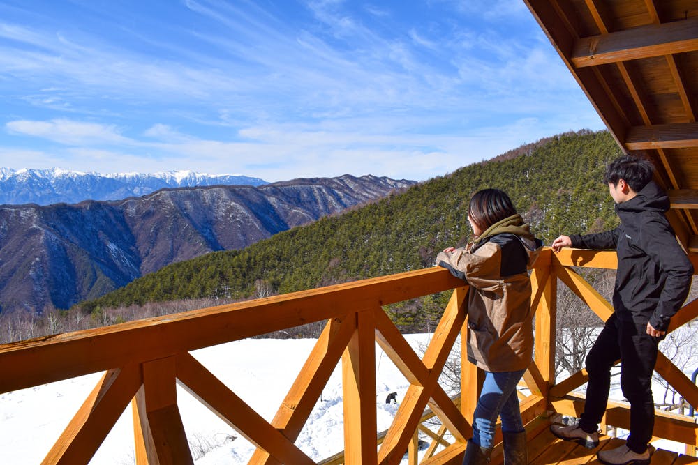 突然ですが、私たちがこのテラスから眺めている景色がこちら!中央アルプスの絶景が望める標高1500mの大自然のなかに、村に訪れるきっかけとなるようなレストランをオープンします。