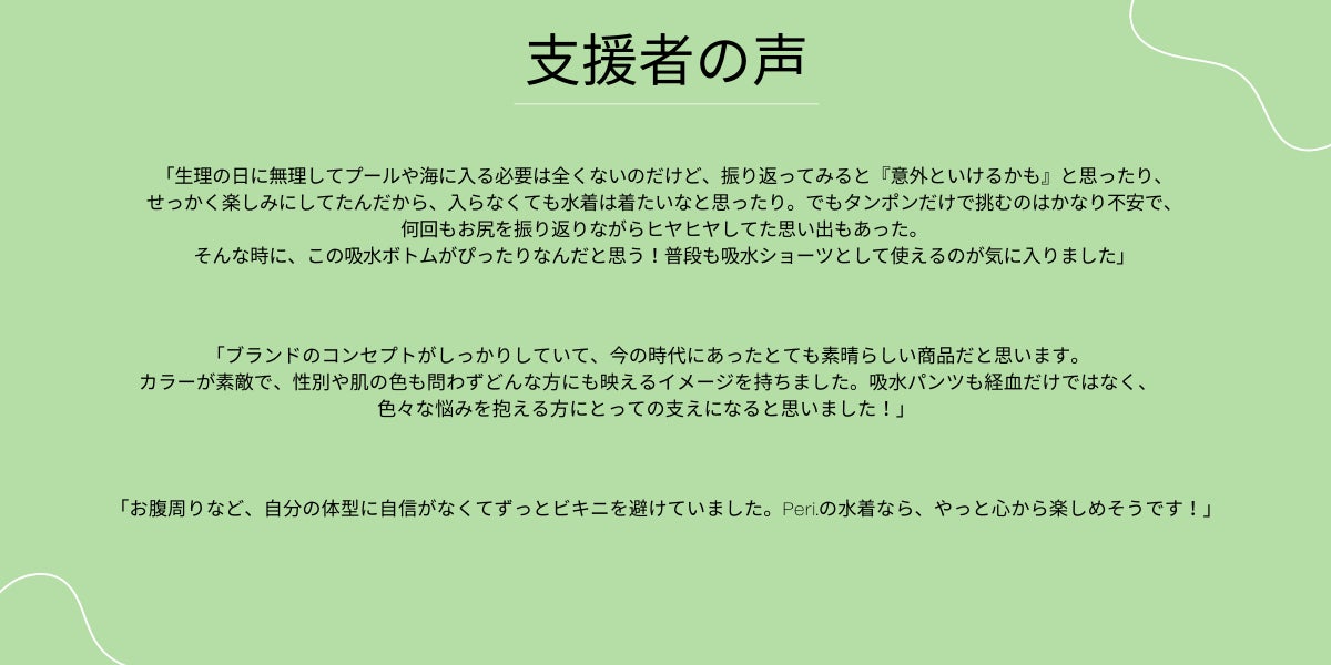 2022/07/26 09:25こんにちは、Peri.です!!CAMPFIRE開始依頼、ブランドのインスタグラムを通して発信してきた内容や頂いた温かい支援の声などをCAMPFIREを見てくださる皆様とも共有したく、CAMPFIRE終了まで残り1週間を迎え、本文に複数箇所追記をいたしました。<<追記箇所>>① 吸水ボトムクロッチ部分の機能構造今回の商品ラインナップにある吸水ボトムには、多くの方に関心と興味を抱いていただいています。ただ、やはり吸水ショーツと違って、吸水水着の場合はどのように機能するのだろうか?吸水とはどういうことなのか?というような疑問の声も多くいただきました。そこで、よりわかりやすい形で吸水構造をご説明できれはと思い、下記情報を追記しました。--------------------------------------------------------------------------------------失禁ショーツなどでも使用されている、吸水力の高い三層構造の特殊な生地を採用。撥水性のある水着表地と肌に優しい水着裏地で挟み込んだ、合計5層構造の吸水スイムボトムを独自開発しました。 ① 水着裏地 ② 吸水速乾加工 ③ 吸水消臭 ④ 透湿フィルム ⑤ 撥水水着表地1層目:水着裏地液体を通過させ、肌に触れる面をサラサラに保ちます。経血の漏れが目立たない、紺色の無地生地を採用。2層目:吸水速乾加工1層目で通過した液体を素早く吸水して漏れをガードしながらも、蒸れを防ぐ速乾加工。3層目:吸水消臭2層目で吸収した水分を保水しながら、強い消臭性で気になるにおいを緩和。4層目:透湿フィルム衣服内の水蒸気や湿気を外に逃がして蒸れを防止。5層目:撥水水着表地水切れがよく、乾きやすい撥水水着生地で外部からの水分を弾きます。② 支援者の声CAMPFIRE開始依頼、支援メッセージ欄やインスタグラムの投稿、コメントなどで多くの方からPeri.の想いに共感頂いております。そのような声をインスタグラムでは個々に紹介していたのですが、CAMPFIREにおいてもまとめて皆さんと共有できればと思い、追記しました。いよいよCAMPFIRE終了まで1週間を切りました…!この機会に、1人でも多くの人に私たちの活動を認知いただき、「誰にとっても優しい社会作り」のためのムーブメントにご賛同いただければとPeri.一同、心より願っております! もっと見る