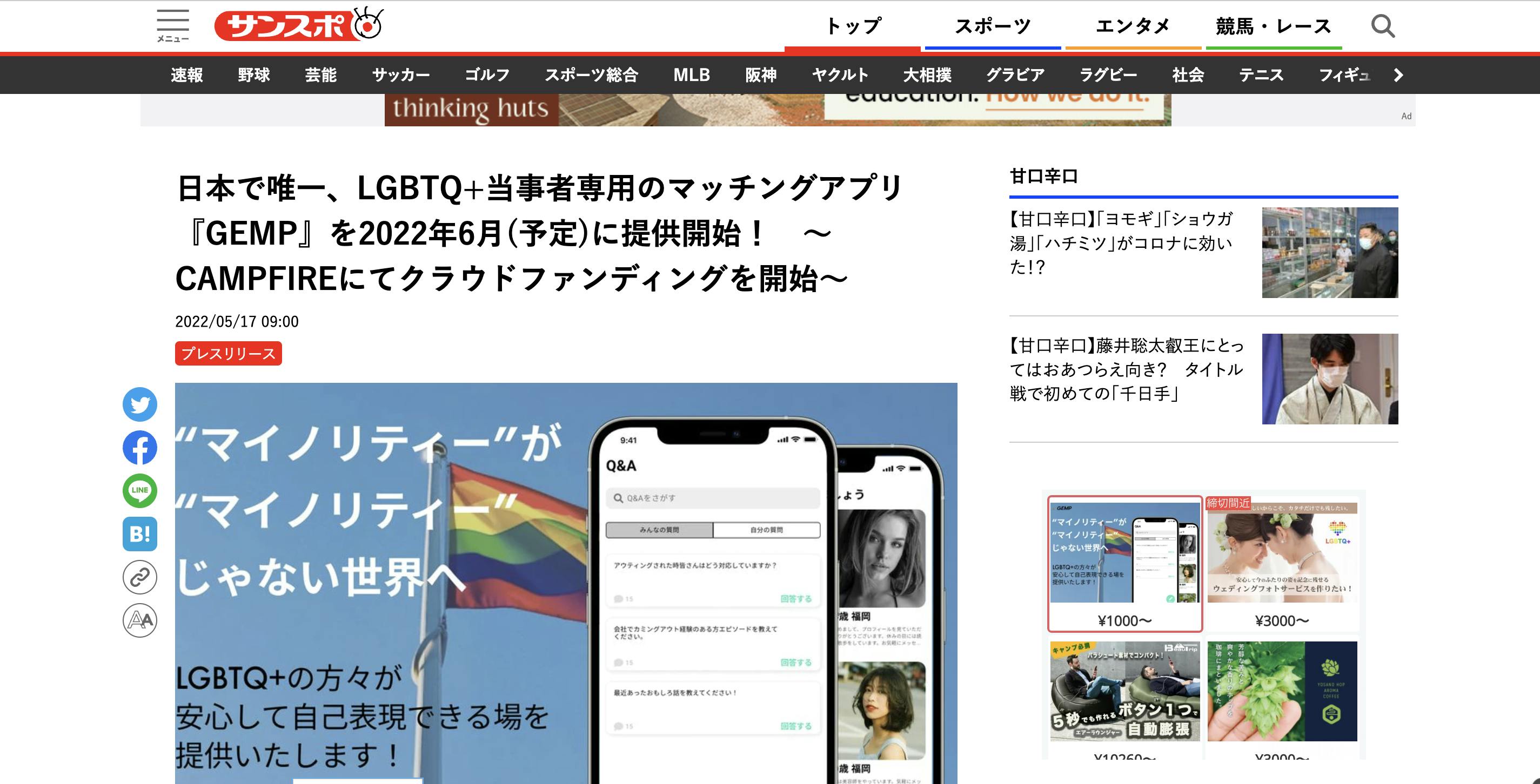 GEMPアプリがSANSPO.COM,朝日新聞デジタルマガジン&、他37Webメディアに掲載されました!